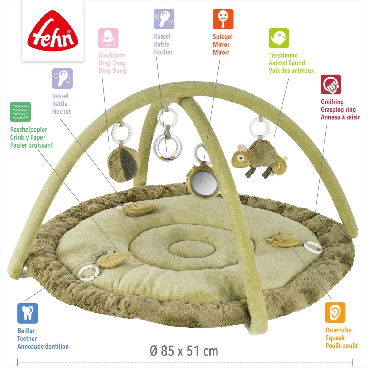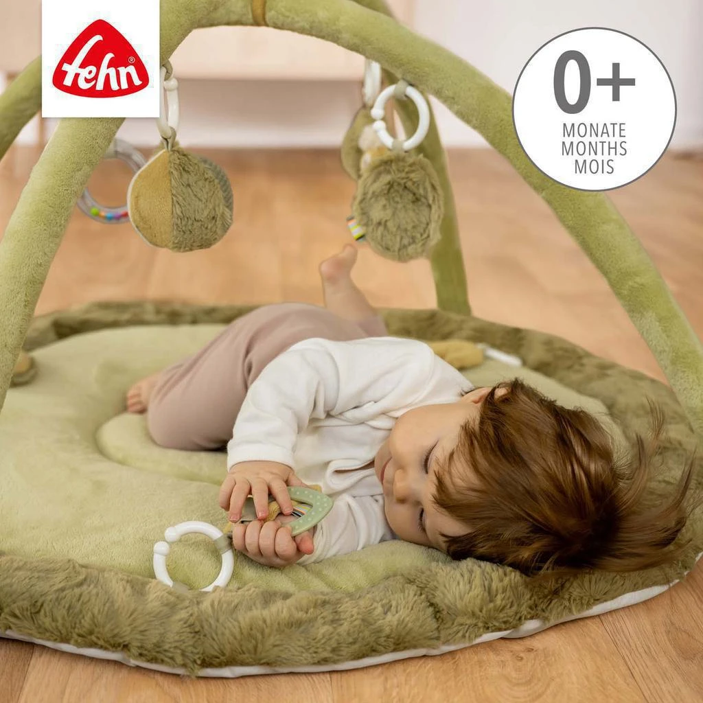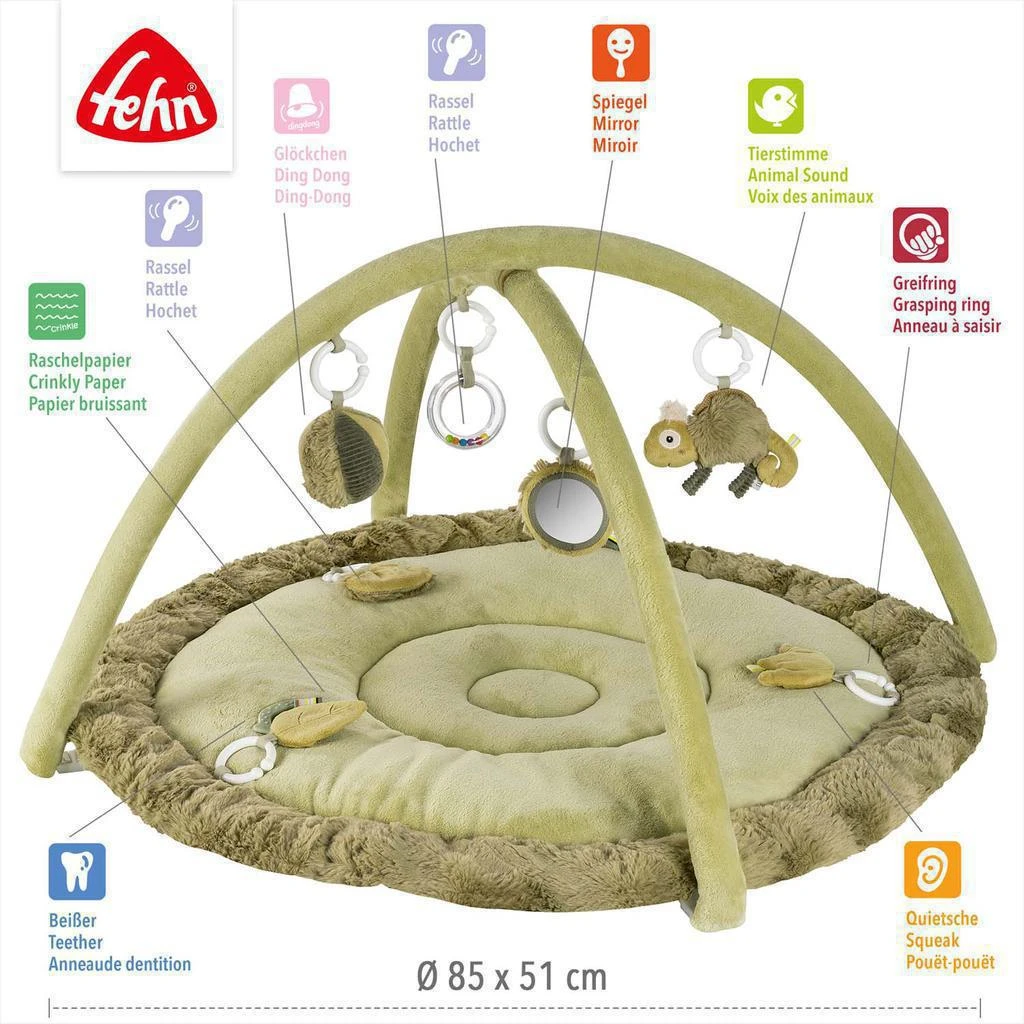Interaktívna deka s priestorom na ležanie z rôznych hebkých materiálov láka bábätko na maznanie, skúmanie a hranie. Tri odnímateľné prvky so šuštiacim papierom, pískatkom a hrkálkou na deke podporujú hmatové vnímanie a koordináciu oko-ruka.
