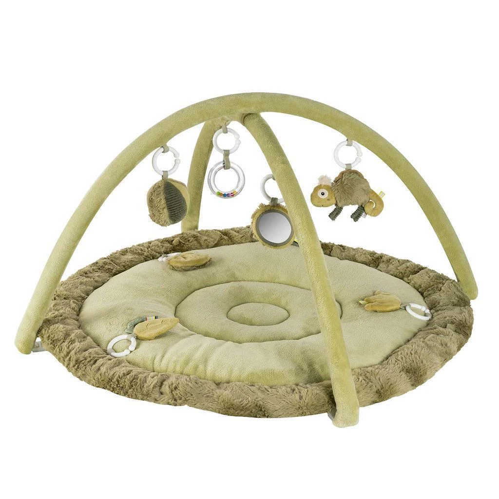 Na dvoch hrazdičkách sú zavesené ďalšie hračky: hrkálka s krúžkami, skrytá rolnička v loptičke, zrkadlo a chameleón so zvieracím zvukom. Tieto prvky upútajú pozornosť dieťaťa, predĺžia dobu sústredenia a prinesú radosť z hry.