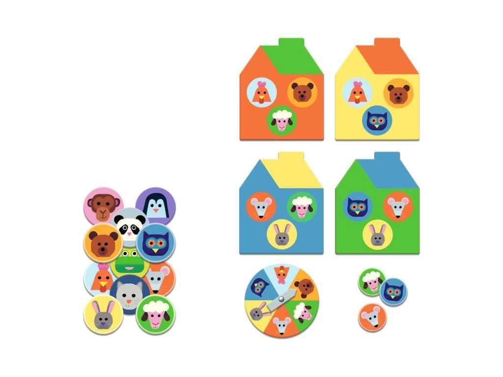 – Loto: 4 siluetové dosky, 1 točiaca šípka, 12 okrúhlych žetónov