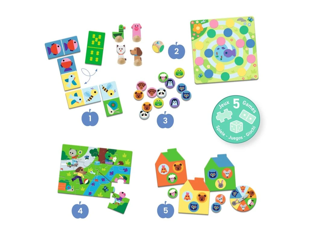 Táto bohatá sada obsahuje 5 klasických vzdelávacích hier pre najmenších – deti sa hrajú a pritom nenápadne rozvíjajú pamäť, logické myslenie aj pozorovacie schopnosti. Nájdu tu puzzle, domino, loto, pexeso aj zábavnú hru s kockou. Roztomilé ilustrácie zvieratiek z farmy urobia radosť každému malému hráčovi. Ideálne pre prvé spoločné hranie a učenie sa pravidlám.
