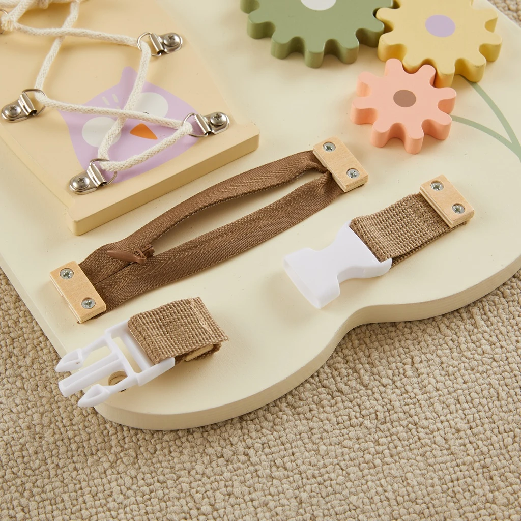 Táto veľká drevená motorická doska v tvare sovy v jemných pastelových farbách zaujme deti už na prvý pohľad.