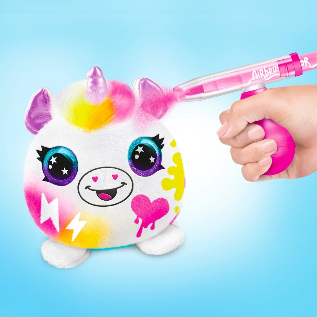 V balení sa ukrývajú dvaja plyšové hračky veľkosti 10 cm – ktorý motív získate, zistíte až po otvorení. Každého z nich si môžu deti originálne ozdobiť pomocou airbrush nástroja, 3 fixiek a 35 šablón, ktoré sú súčasťou sady.