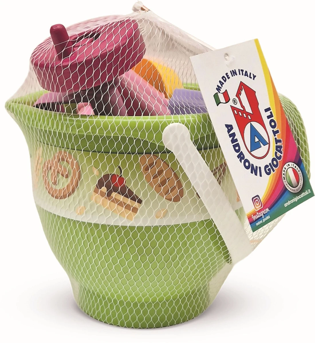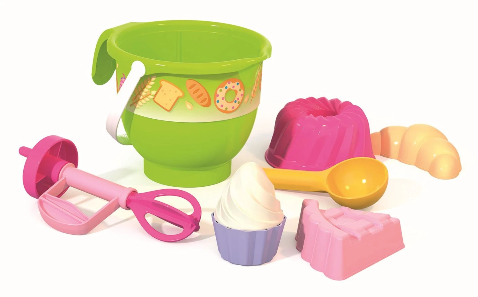 6dielna sada na piesok, vyrobená z kvalitných plastov v Taliansku. Obsahuje: 1 kýblik na piesok v tvare vyššej misy s uchom, 1 tvorítko v tvare bábovky, 1 tvorítko na tortu, 1 kopčekovač na zmrzlinu a 1 ručný šľahač.