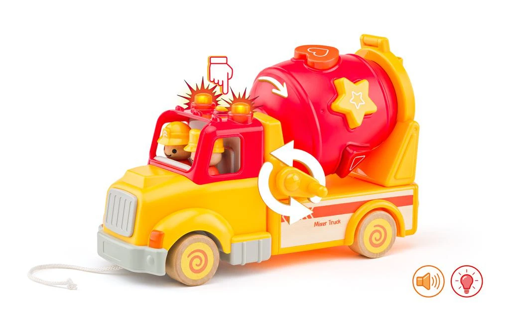 Miešačka je vyrobená v kombinácii kvalitného plastu a dreva. Stlačením tlačidla na kabíne vodiča sa aktivuje svetlo a zvuk.