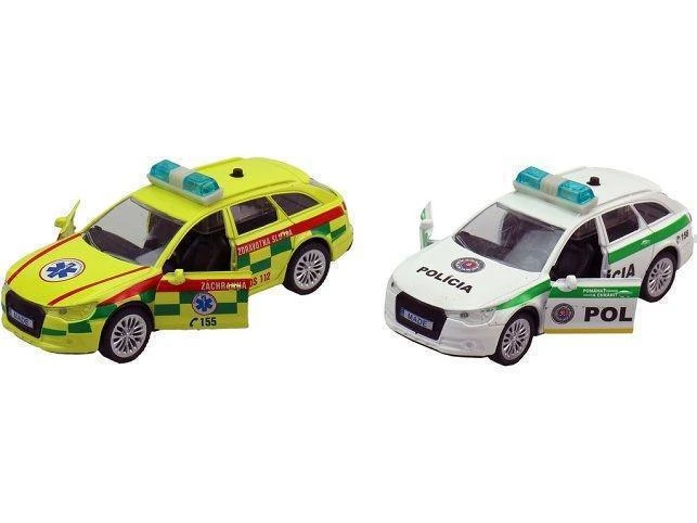 Auto záchrannej zdravotníckej služby a polície. Ambulancie aj policajné auto sú v dizajne, ktorý poznáme zo slovenských ciest a diaľnic. Pohon autíčka je na spätné natiahnutie. Obsahuje funkčný maják a zvukové efekty.