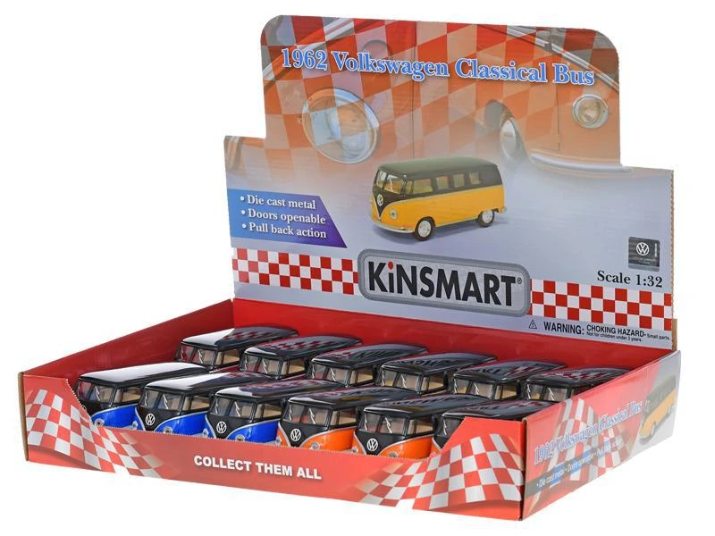 Autobus VW Classical 1962 v mierke 1:32 o rozmere 13cm. Kovový autobus je na spätný chod. V ponuke v 4 farebných variantoch.