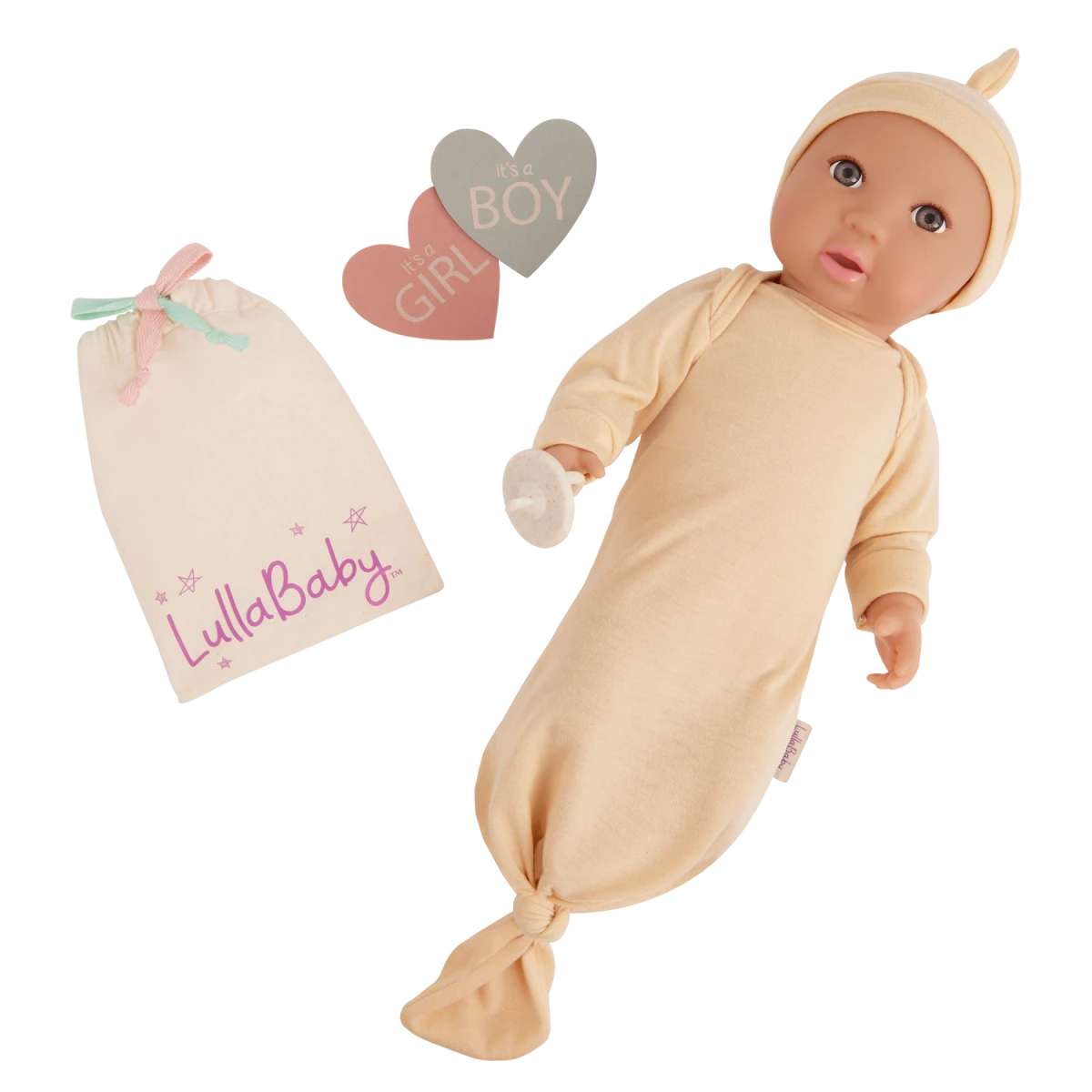Zažite čarovný okamih odhalenia pohlavia budúceho súrodenca vášho dieťaťa s bábikou LullaBaby Gender Reveal! Súčasťou balenia sú dve kartičky s nápisom Girl a Boy a oblečky pre dievčatko a chlapčeka. Vaše dieťa tak po vytiahnutí kartičky a oblečku z textilného vrecka nezabudnuteľným spôsobom zistí, či sa môže tešiť na sestričku alebo bračeka.