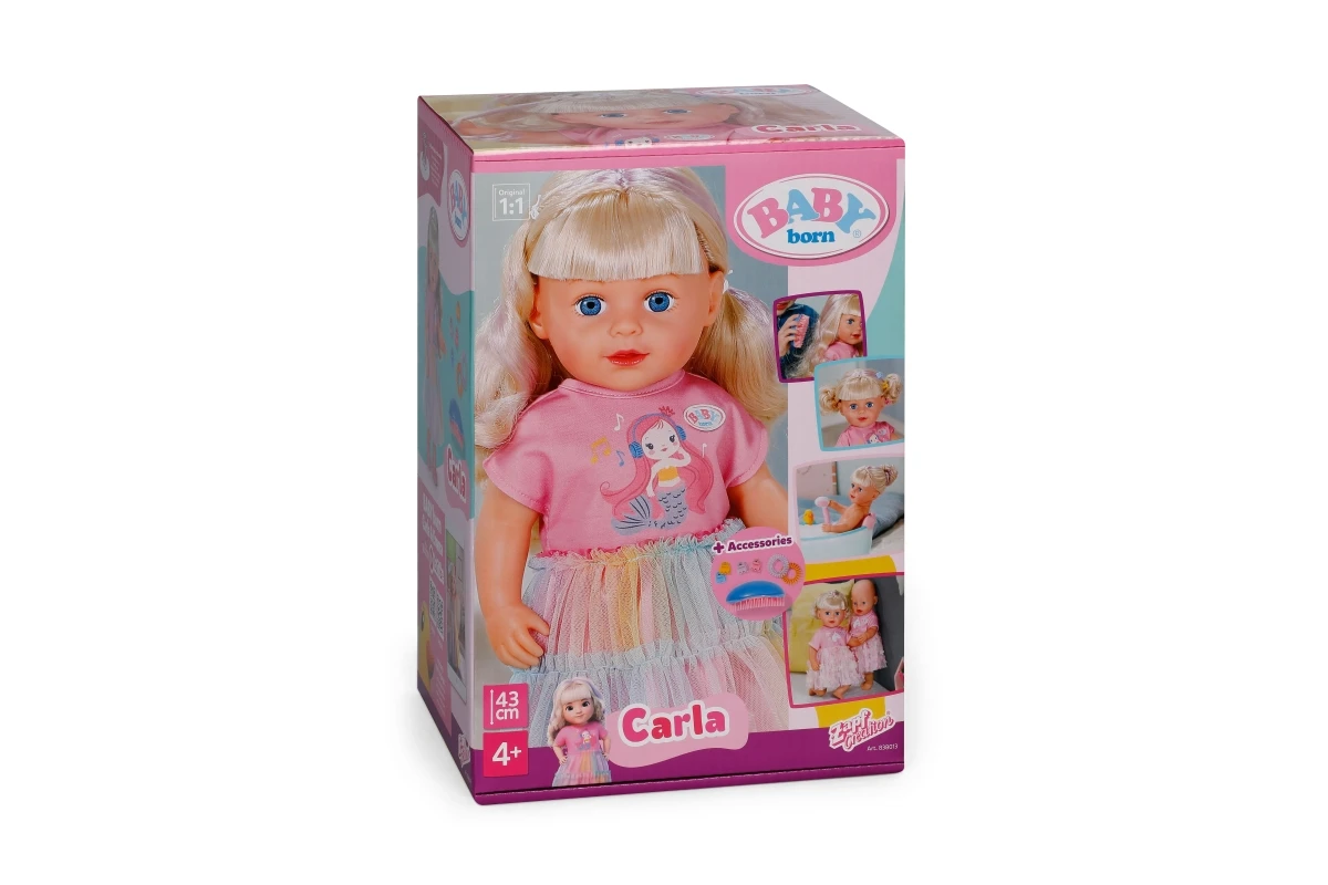 BAby Born Carla má veľkosť 43 cm a ponúka autentický zážitok vďaka svojim realistickým funkciám a mäkkému telíčku. Je vhodná pre deti od 3 rokov, ktoré chcú rozvíjať empatiu a opatrovateľské zručnosti.