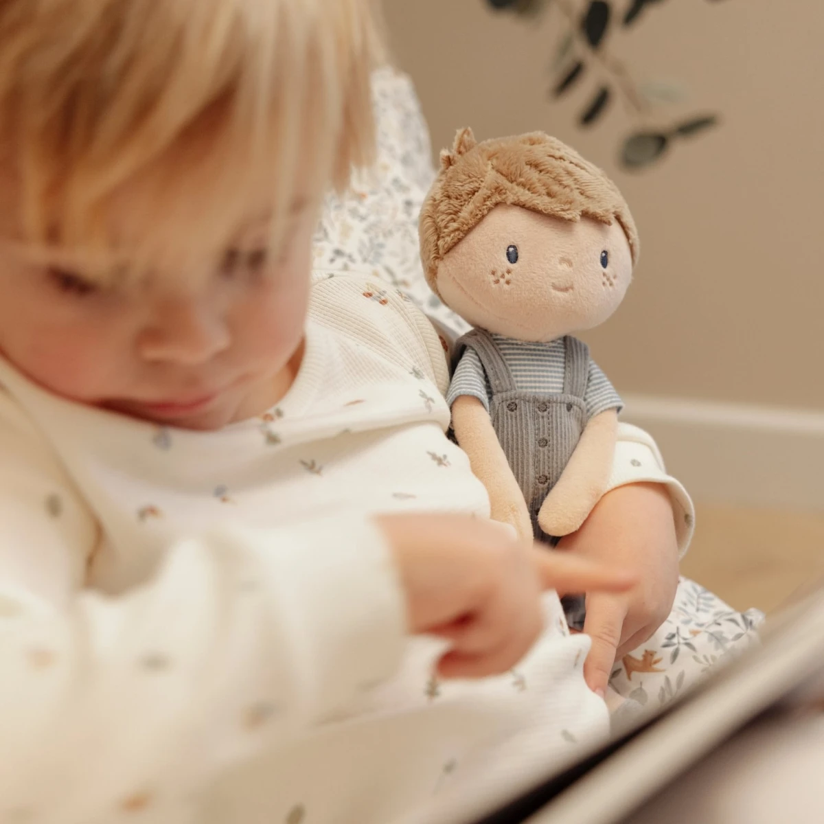 Originálna plyšová bábika v podobe chlapčeka Jima v menčestrových nohaviciach s trakmi. Bábika z mäkkého jemného materiálu je ideálna ako prvá bábika pre vaše dieťa, je vhodná na hranie aj maznanie a bude sa s ňou aj krásne zaspávať!