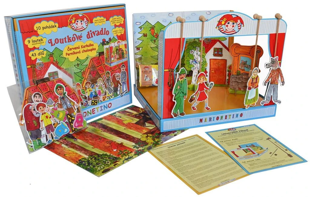 Tento bábkový set obsahuje skladacie bábkové divadlo, 9 bábok, 5 drevených vodiacich tyčiek, lepiacu hmotu, 9 rekvizít, 5 scén, 4 scénické doplnky so stojanmi a 10 rozprávok na stiahnutie zadarmo. Vyrobené z knihárskej lepenky, dreva a laminovaného kartónu. Podporuje rozvoj jemnej motoriky, improvizácie a vyjadrovania u detí.