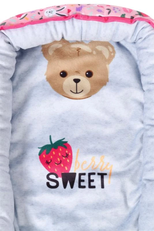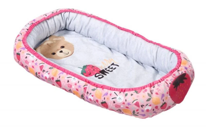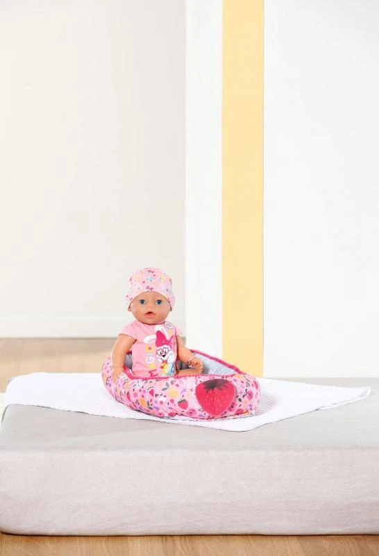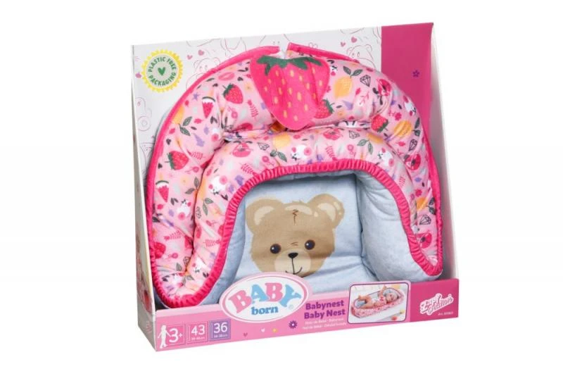BABY born ticho leží vo svojom hniezdočku a užíva si pohodlie. Farebné hniezdočko v hravom dizajne s obrázkami ovocia a zvieratiek má v spodnej časti uzatvárateľný otvor, takže BABY born je možné ľahko vybrať z hniezdočka, vložiť ju do neho a hrať sa s ňou v hniezdočku.