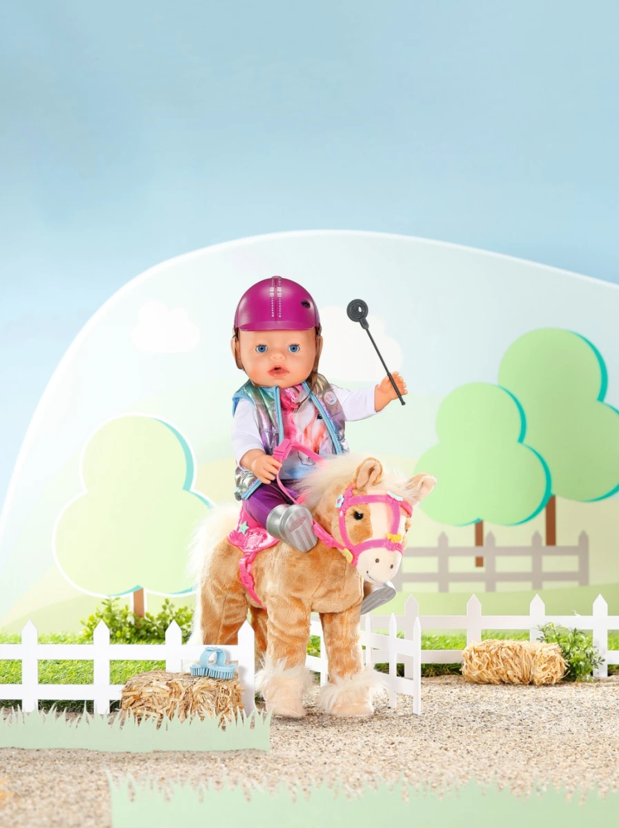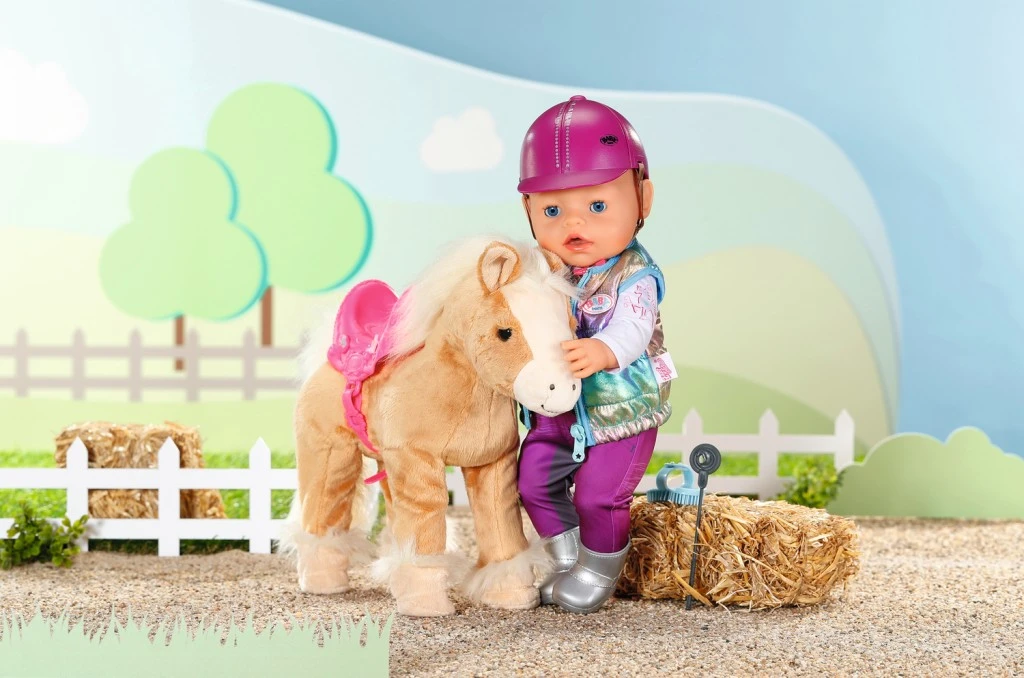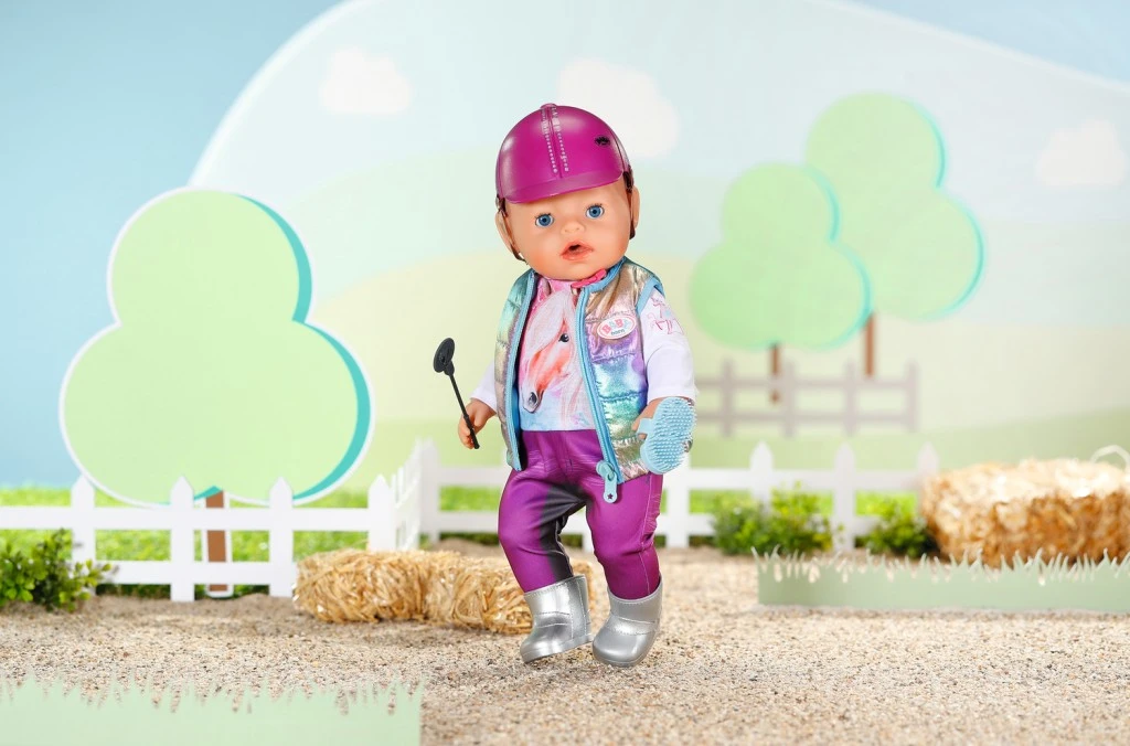 Pripravte sa na deň plný dobrodružstva v stajniach! BABY born teraz môže vyraziť za svojim koníkom v perfektnom jazdeckom outfite.