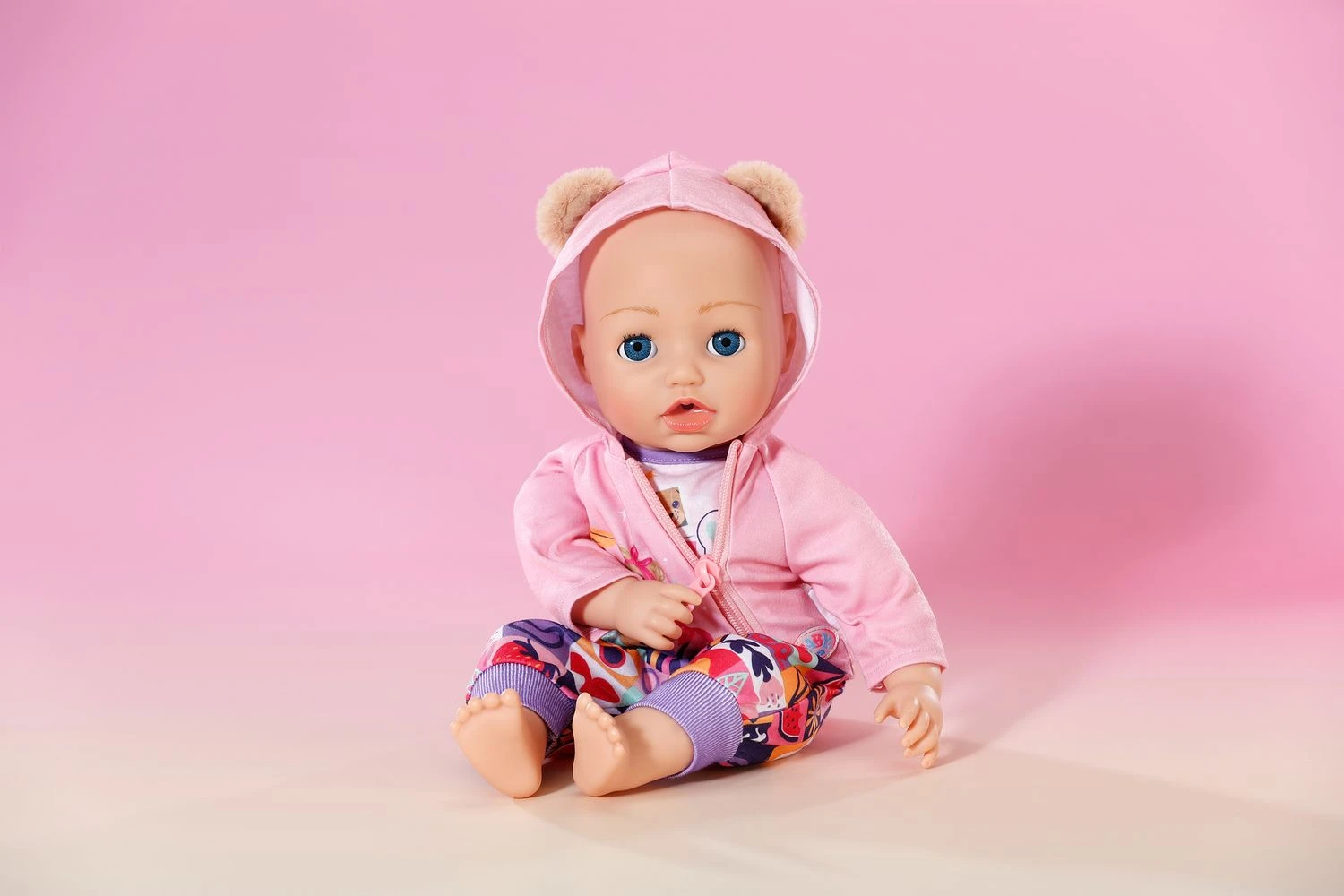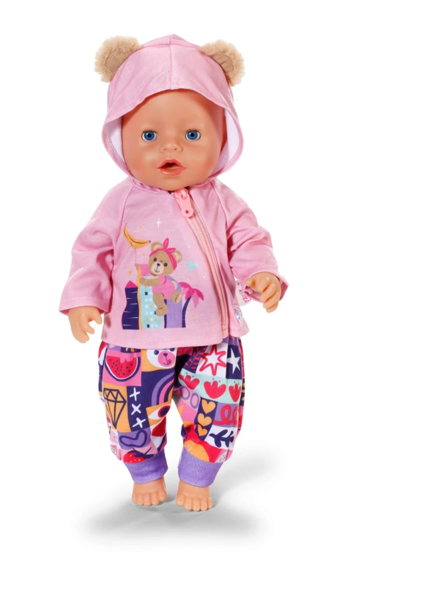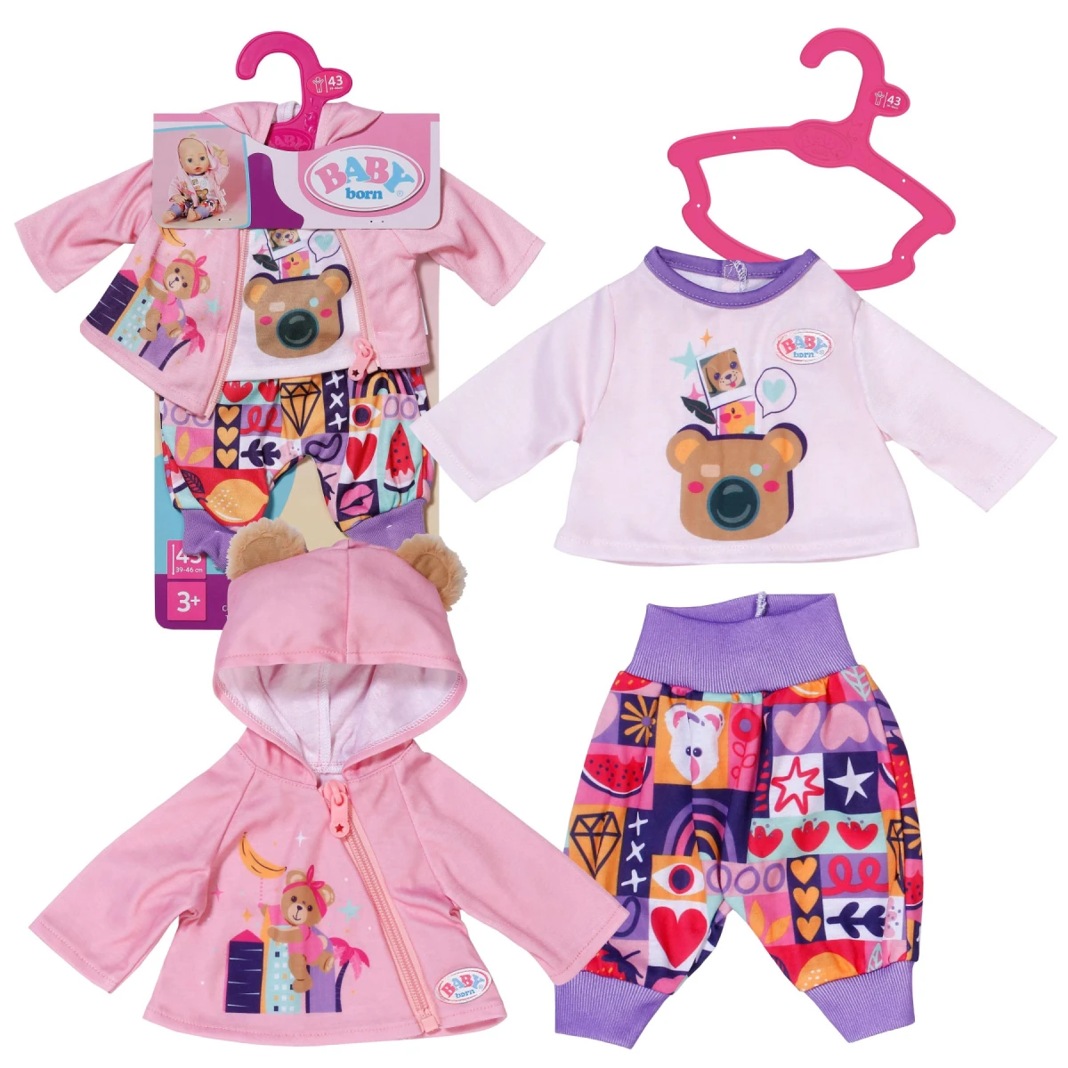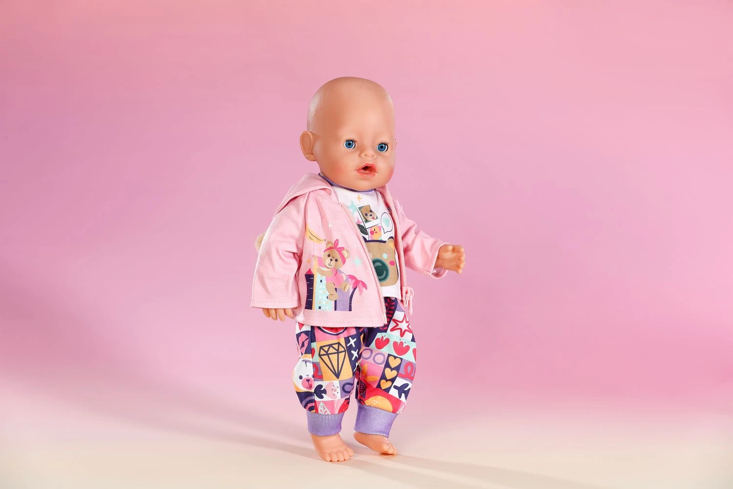 Roztomilý obleček pre bábätko sa skladá z troch častí: farebných nohavíc s fialovými lemami a patchworkovým vzorom vo veselých farbách, svetlo fialového trička s dlhým rukávom ozdobeného obrázkom medvedíka a roztomilé ružové bundy s kapucňou, ktorá má roztomilá hebká med. Vďaka tomuto outfitu je Baby born vždy krásne v teple.