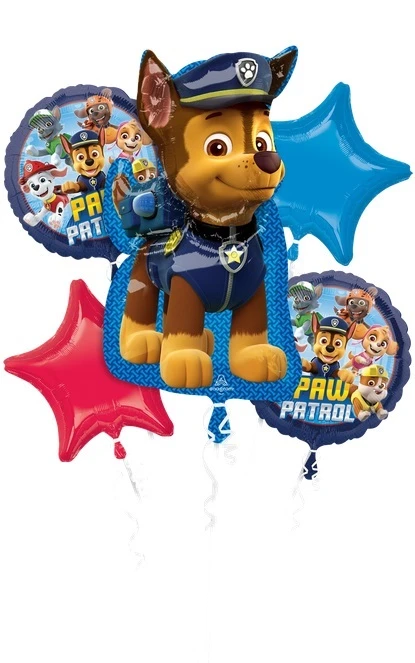 Buket fóliových balónikov Tlapková patrola - 5 kusov je perfektná dekorácia pre detské narodeniny alebo tematickú oslavu s motívom obľúbeného seriálu Paw Patrol. Veselé postavičky záchranárskych psíkov dodajú každej oslave hravú a dobrodružnú atmosféru, ktorú si deti okamžite zamilujú.