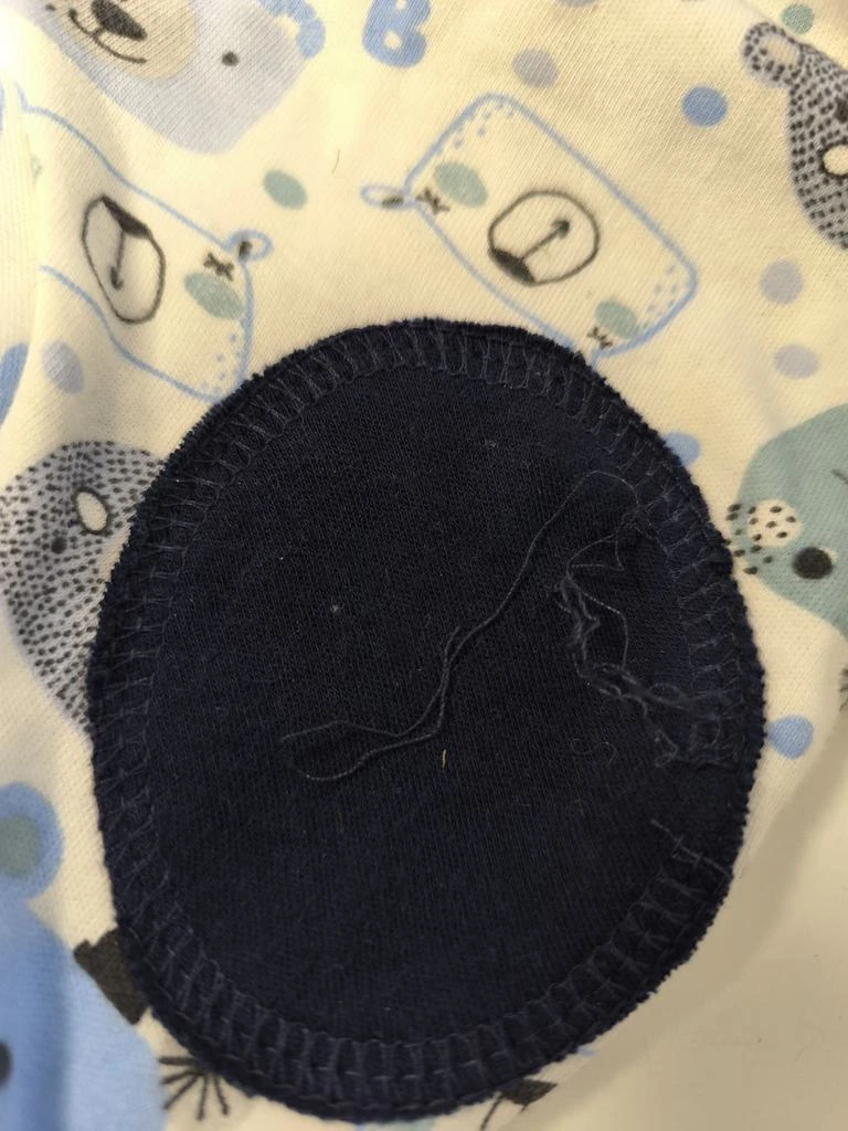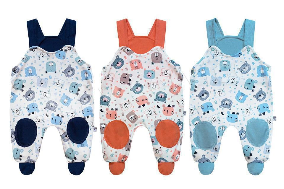 Bavlnené polodupačky - lacláčky pre dojčatá s potlačou medvedíkov majú na kolienkach nášivky pre lepšie pohodlie bábätka pri jeho putovaní.