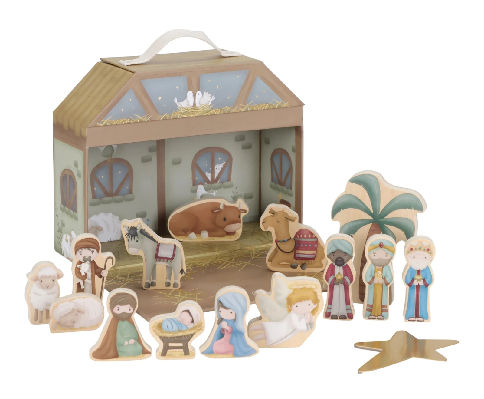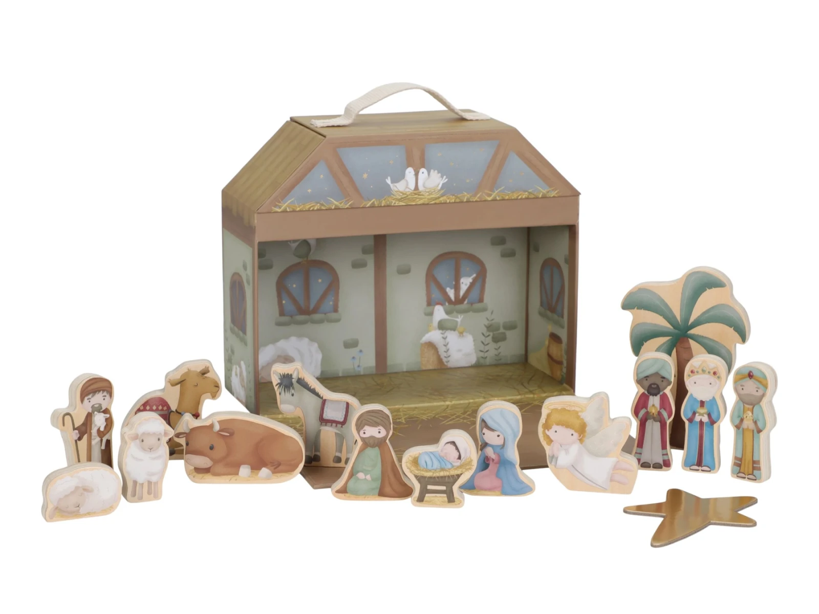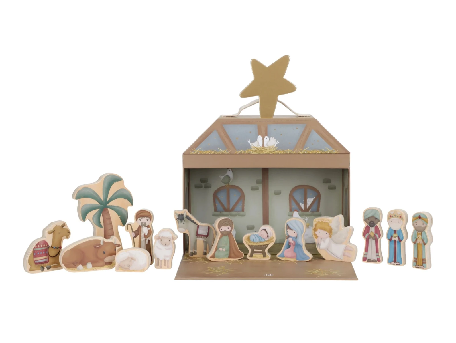 Krásny betlehem s postavami z tradičného vianočného príbehu poteší vás aj vaše deti každé Vianoce. 14 postavičiek je vyrobených z dreva, chliev z kvalitného pevného kartónu slúži aj ako prenosný a úložný kufrík.