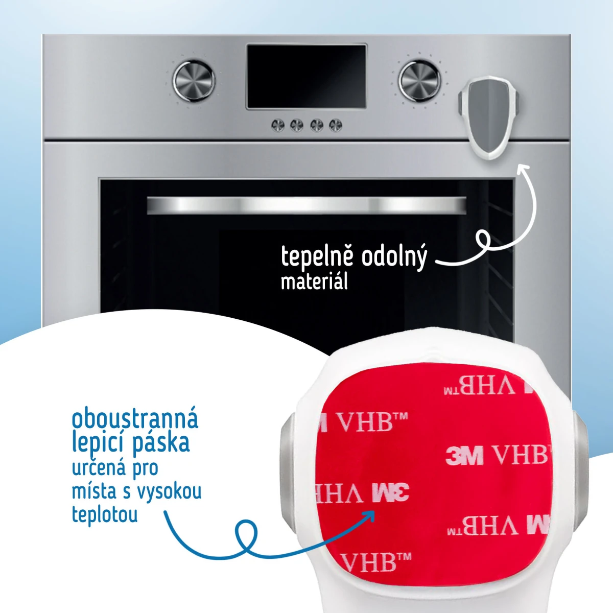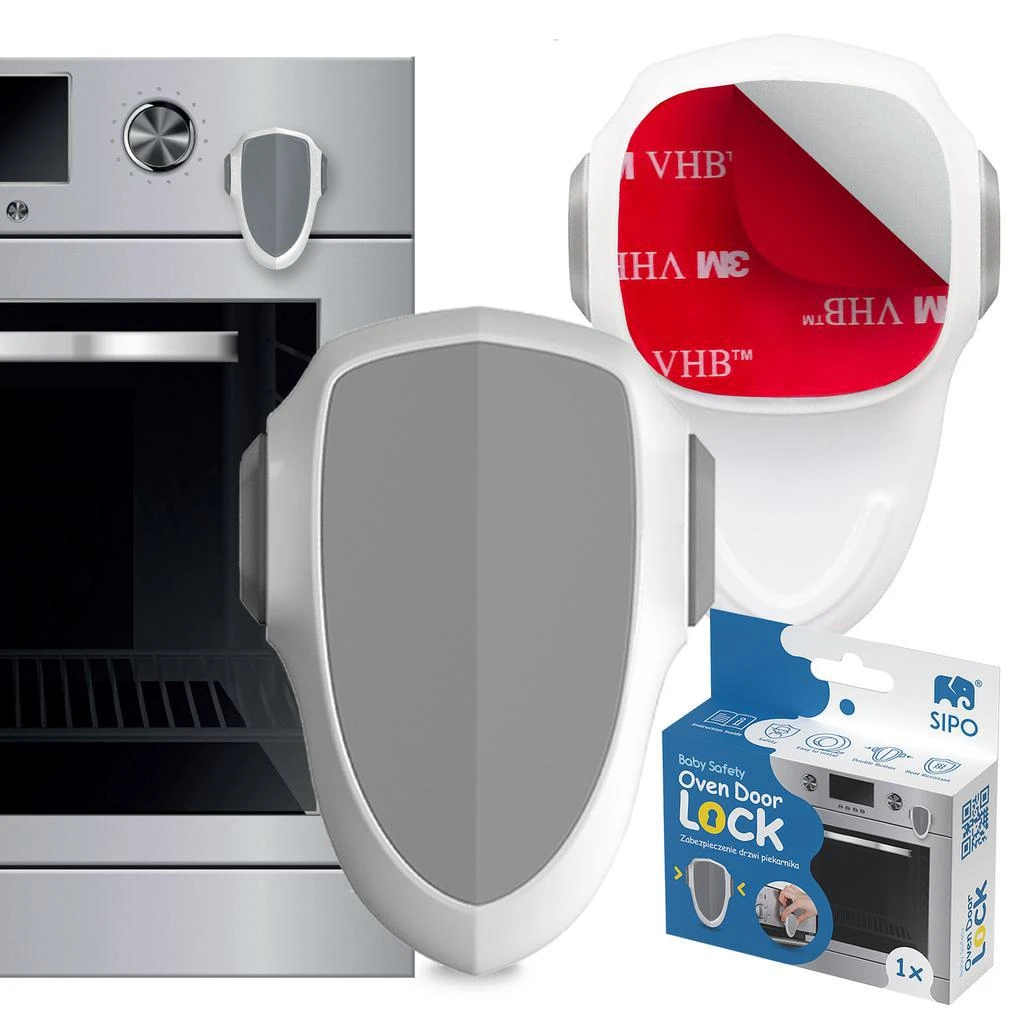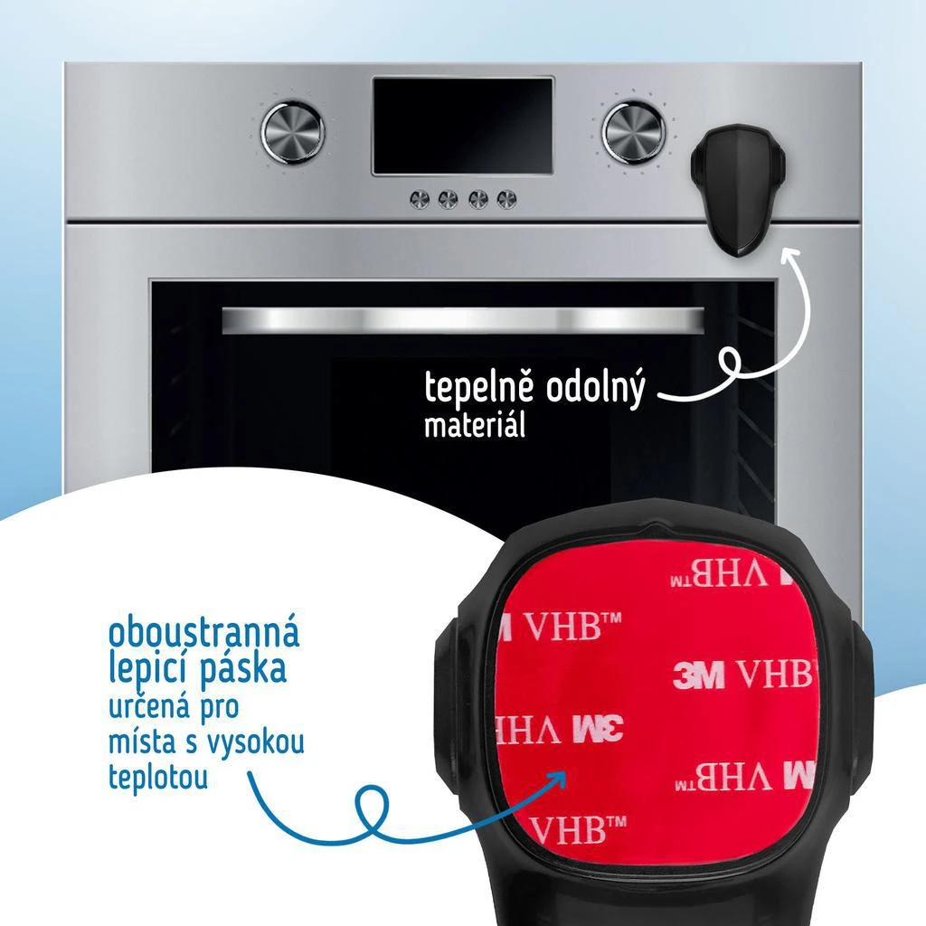 Vďaka špeciálnej otočnej konštrukcii je možné naše zámky na dvierka rúry inštalovať takmer na ľubovoľné miesto a správne tak zablokovať otváranie dvierok. Navyše ho nemusíte zakaždým dávať dole, aby ste mohli rúru otvoriť, stačí len súčasne stlačiť tlačidlá po stranách a otočiť zámok v ľubovoľnom smere. Materiál je odolný voči vysokým teplotám a pre miesta, kde sa vyskytujú vysoké teploty, je priložená špeciálna lepiaca páska.