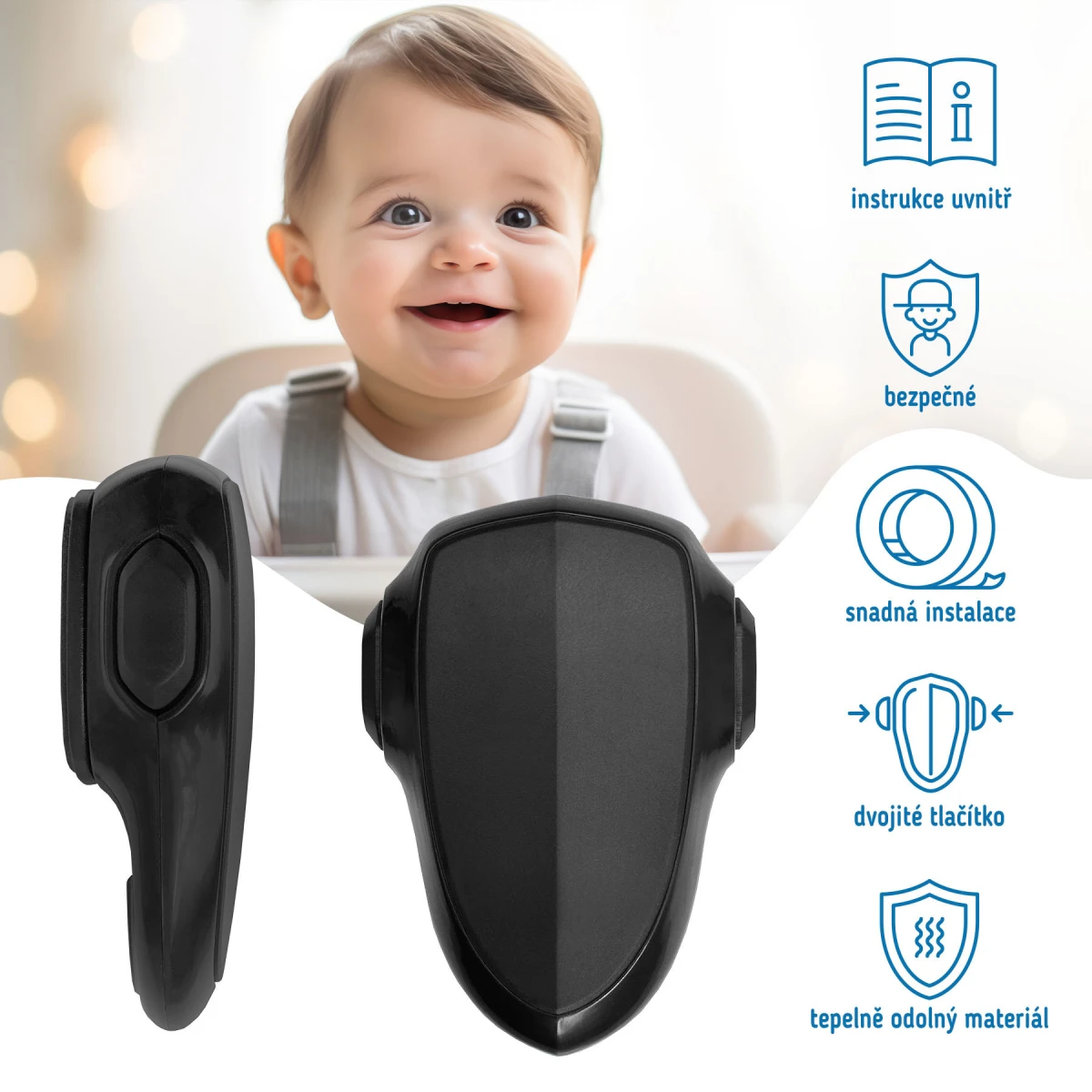 DOPLŇUJÚCE INFORMÁCIE: Vždy postupujte podľa priložených pokynov. Pomôcka je určená na domáce použitie. Nepoužívajte výrobok iným spôsobom, než pre aký bol určený a aký je popísaný v priložených pokynoch. Výrobca nezodpovedá za škody vzniknuté v dôsledku použitia výrobku v rozpore s jeho určením. Upozorňujeme, že niektoré deti môžu ochranu odstrániť. Z tohto dôvodu odporúčame pravidelne kontrolovať stav bezpečnostnej pomôcky – zámku.
