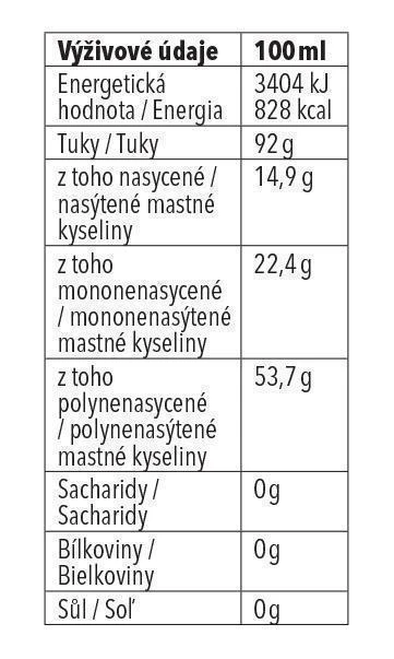 Vďaka vysokému obsahu kyseliny linolovej prispieva tento za studena lisovaný olej k udržaniu normálnej hladiny cholesterolu v krvi. Obsahuje približne 1% esenciálnych olejov, ktorých jemne hrejivá, korenená vôňa povznáša náladu. V starostlivosti o pokožku ju výborne hydratuje a je vhodný na uvoľňujúce masáže.