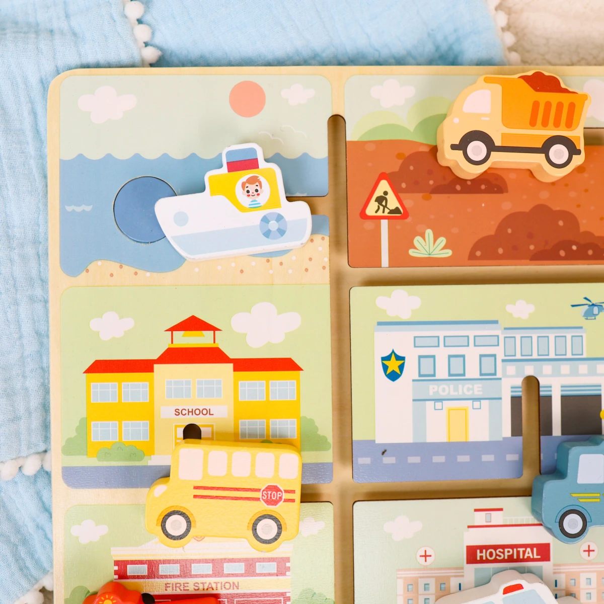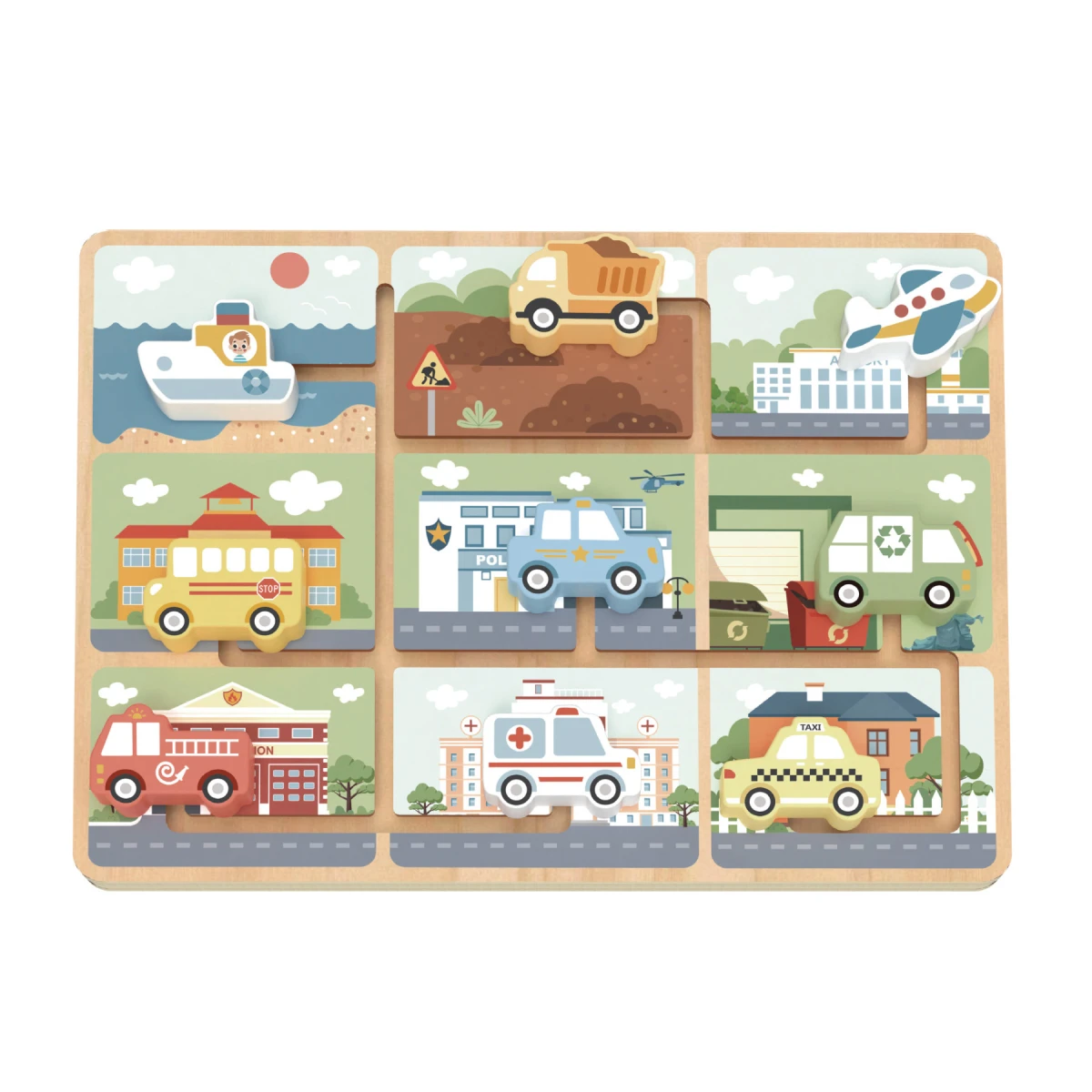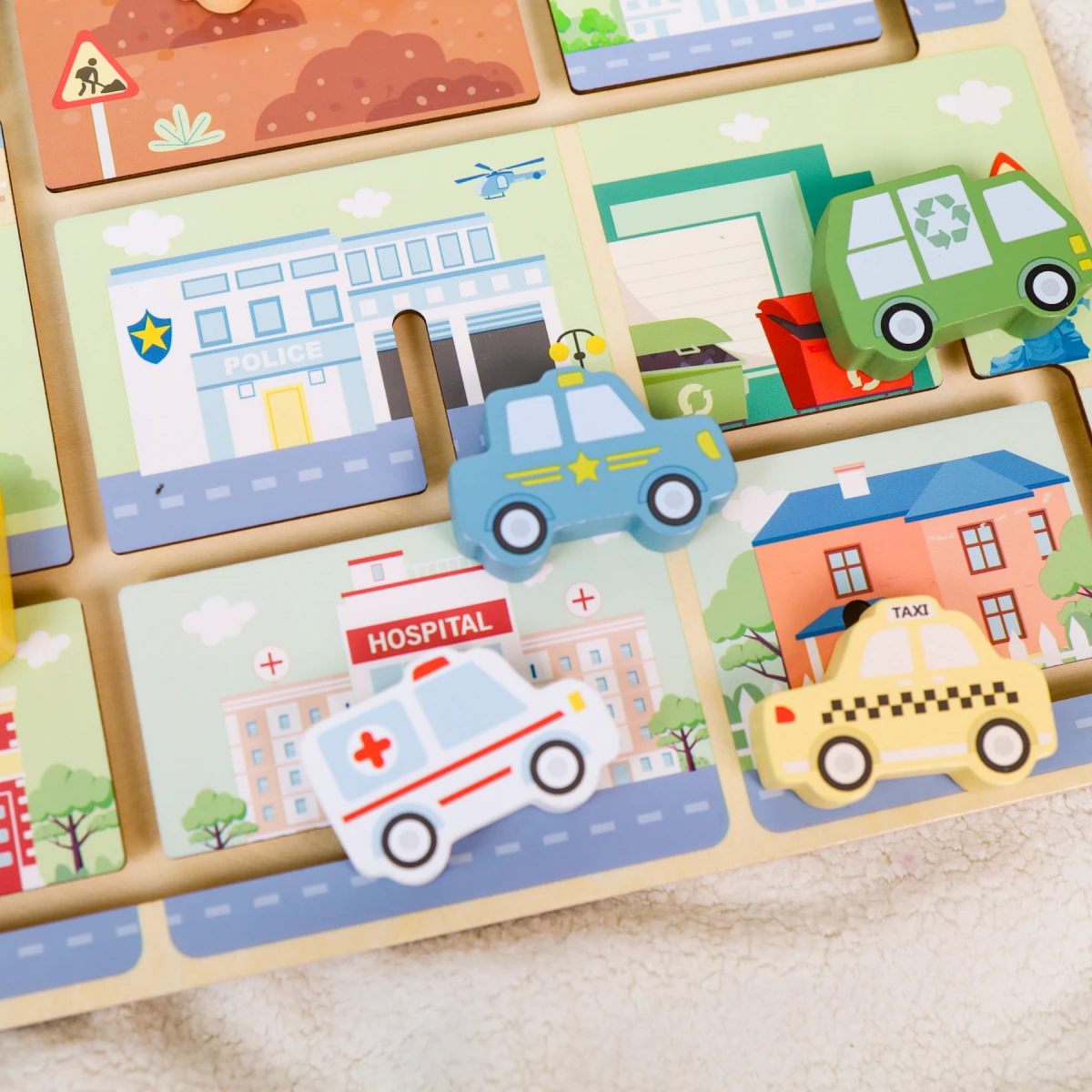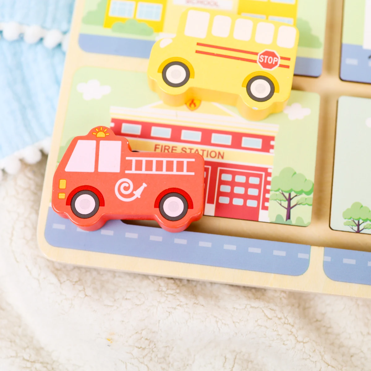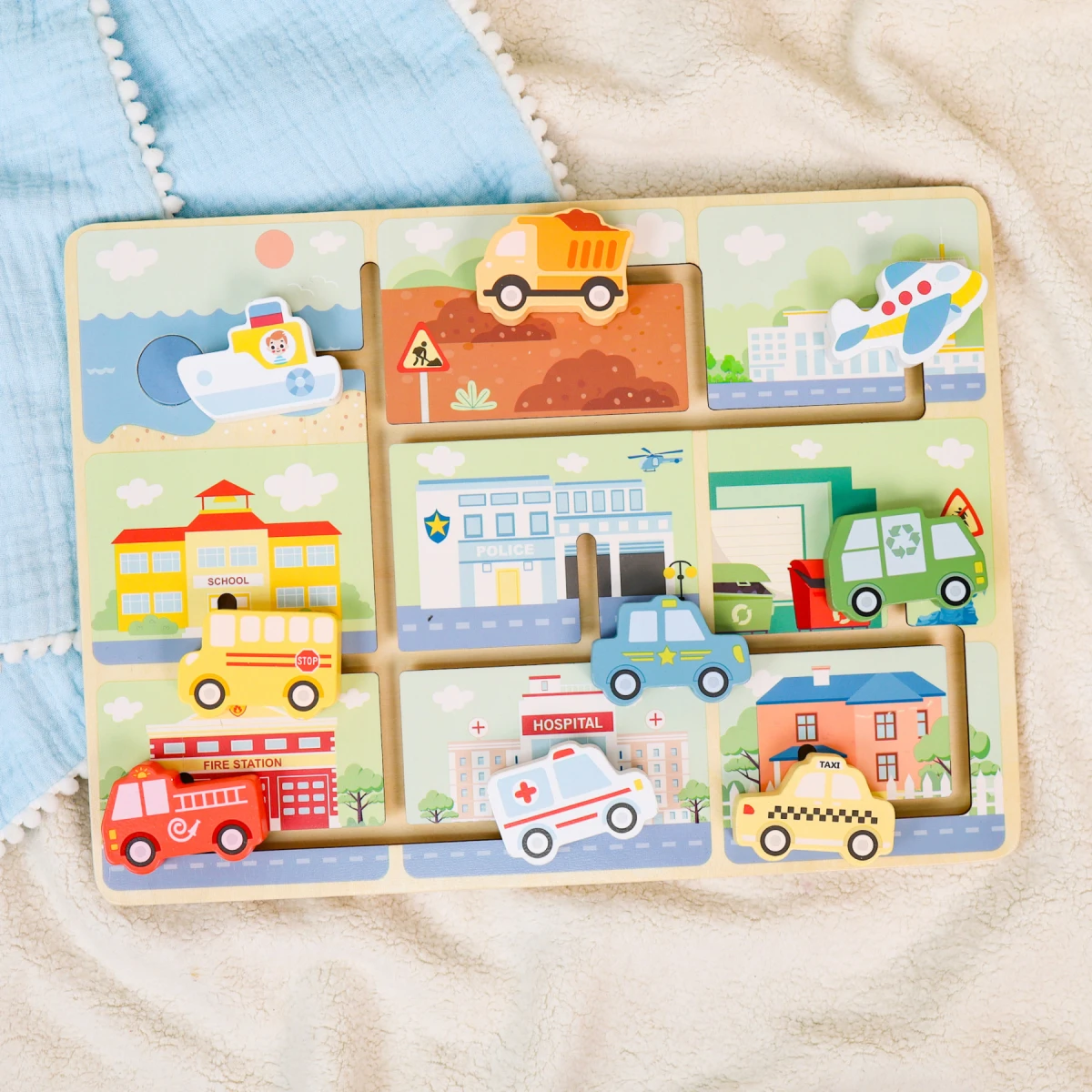 Malí vodiči na veľkej ceste objavovania! Tento drevený motorový labyrint v jemných pastelových farbách od značky Tooky Toy uvádza deti do sveta dopravy.