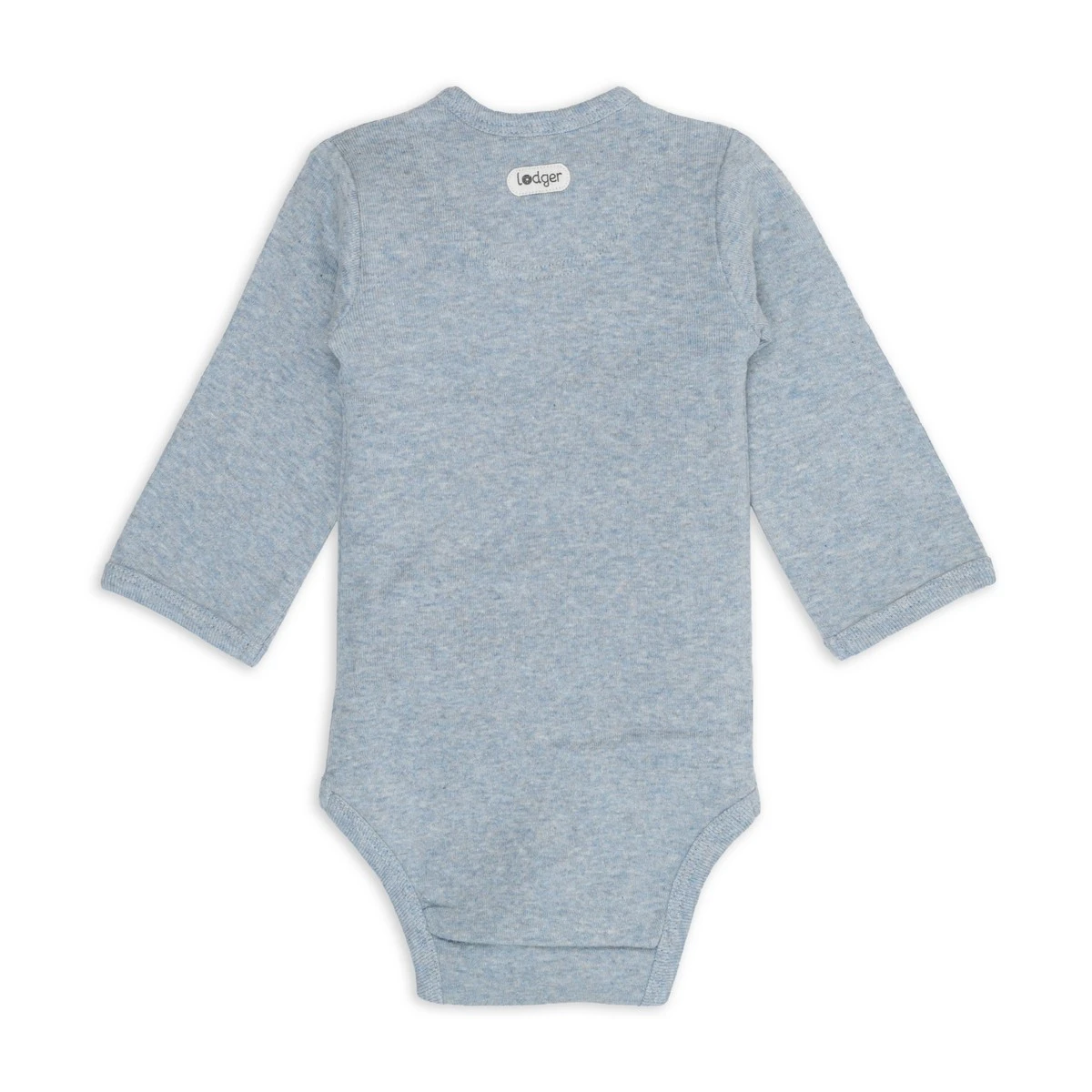 LODGER Body s dlhým rukávom Melange Blue Fogg je zavinovacie body s dlhým rukávom vyrobené zo 100% organickej bavlny. Jemne melírované (melange) prevedenie dodáva moderný vzhľad, zatiaľ čo praktické zapínanie na cvoky umožňuje ľahké obliekanie a vyzliekanie.