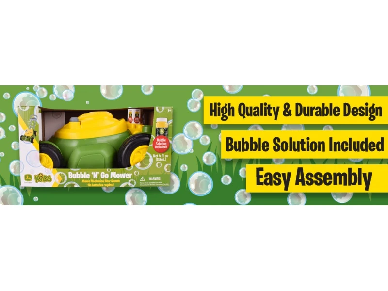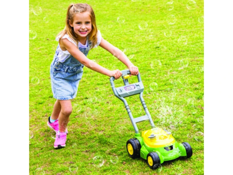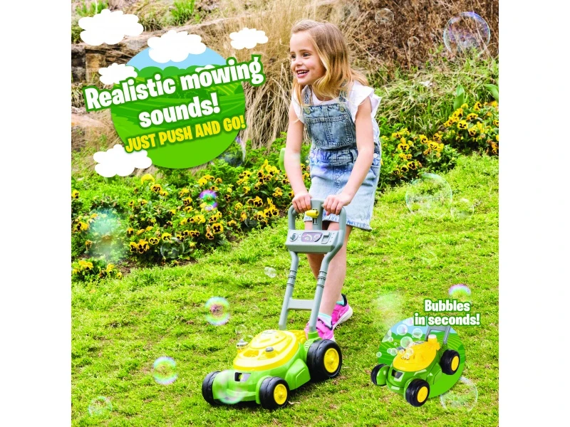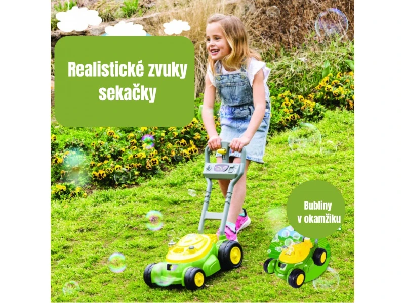 Slnečné popoludnie, smiech vášho dieťaťa, a stovky trblietavých bublín tancujúcich vo vzduchu. Váš malý záhradník s hrdosťou tlačí svoju vlastnú kosačku John Deere - presne ako to robí otec alebo dedo.