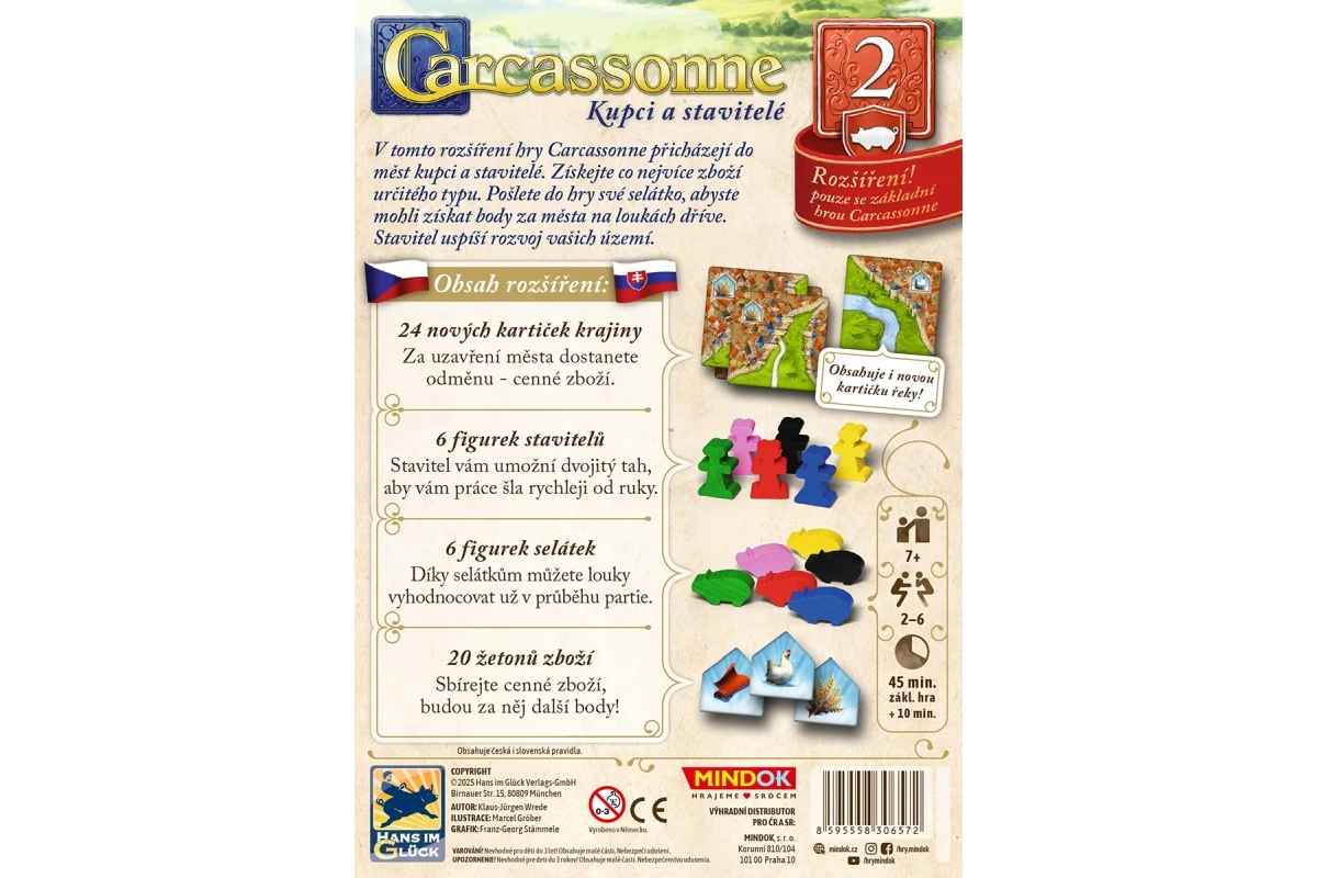 Rozšírenie Kupci a stavitelia prinášajú do sveta Carcassonne nové obchodné príležitosti a strategické figúrky. Zbierajte žetóny tovaru z dokončených miest a na konci hry získajte body za najväčšiu zbierku.