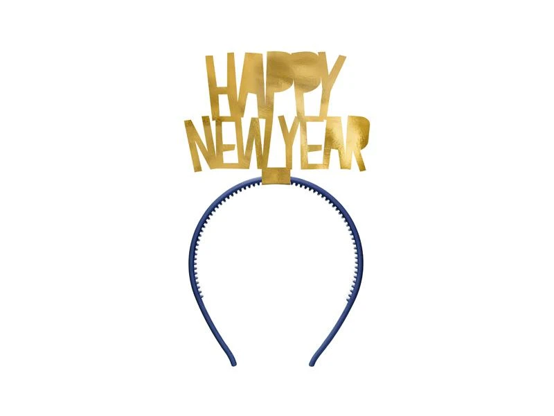 Čelenka na novoročnú oslavu v modrej farbe so zlatým lesklým nápisom Happy New Year.