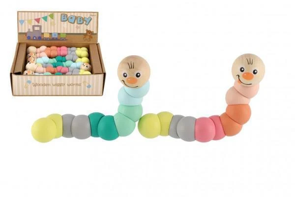 Drevené kĺbové zvieratko húsenica o veľkosti cca 16 cm.