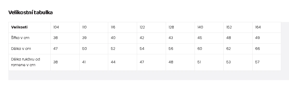 | Veľkosť | 104 / 110 / 116 / 122 / 128 / 140 / 152 / 164 |