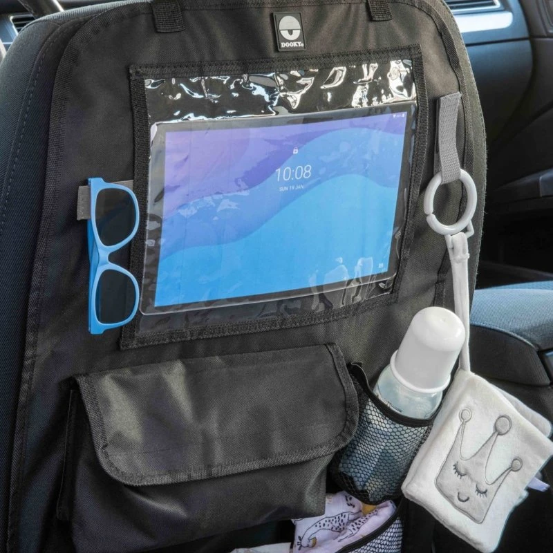 Organizér sa jednoducho upevňuje na zadnú stranu sedadla vodiča alebo spolujazdca. Má mnoho praktických priehradok a priehľadné vrecko v úrovni očí na tablet (rozmer 26cm x 20cm). K dispozícii sú tiež praktické pútka na zavesenie napr. hračiek či slnečných okuliarov. Dooky Back Seat organizér je skvelý pre deti aj rodičov, pretože umožňuje mať všetky nevyhnutnosti na dosah!