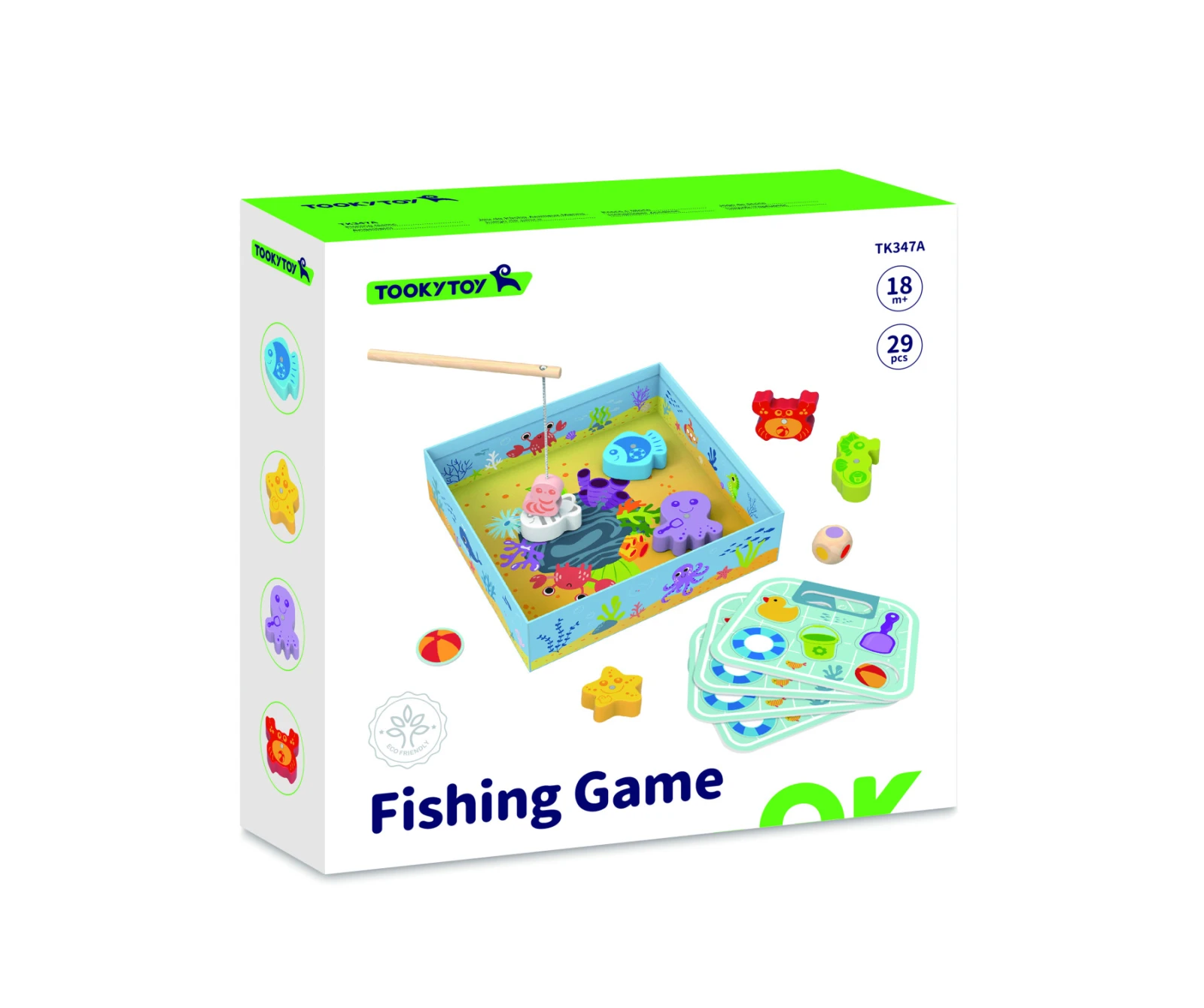 - Obsahuje: 1 rybársky prút s magnetom, 1 kocku, 1 podložku predstavujúcu more, 6 drevených morských tvorov a 4 kartónové hracie karty, ktoré sa používajú na zbieranie bodov počas hry.