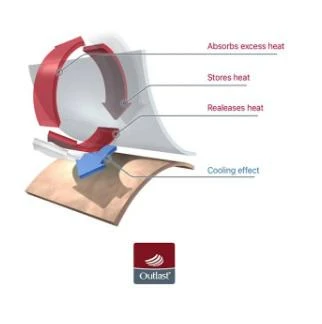 Tento materiál dokáže regulovať telesnú teplotu, nadbytočné teplo odvedie, uschová av prípade ochladenia tela zahreje. Vďaka týmto jedinečným vlastnostiam materiál Outlast® poskytuje teplotný komfort po celú dobu nosenia.
