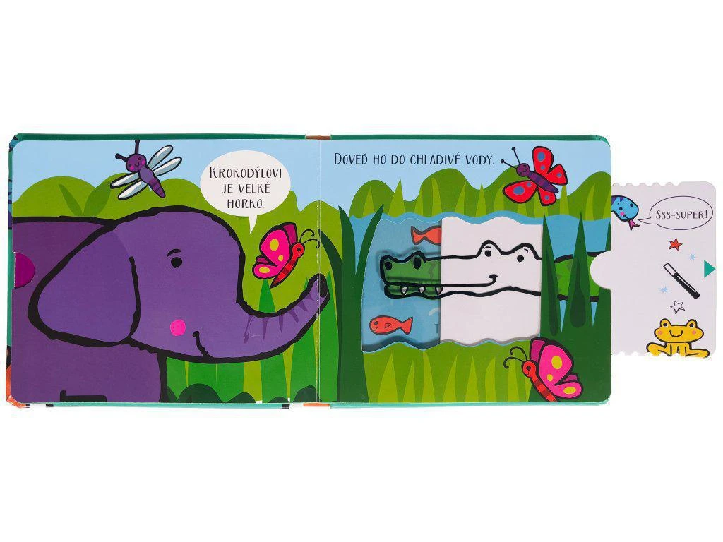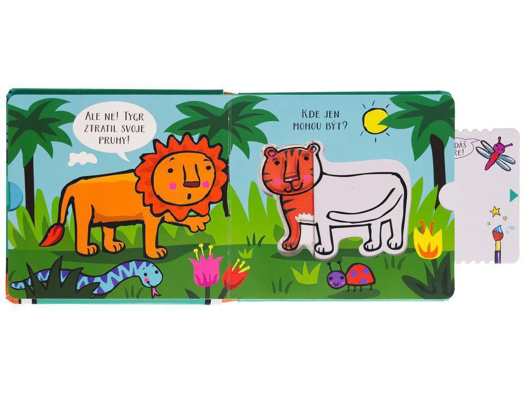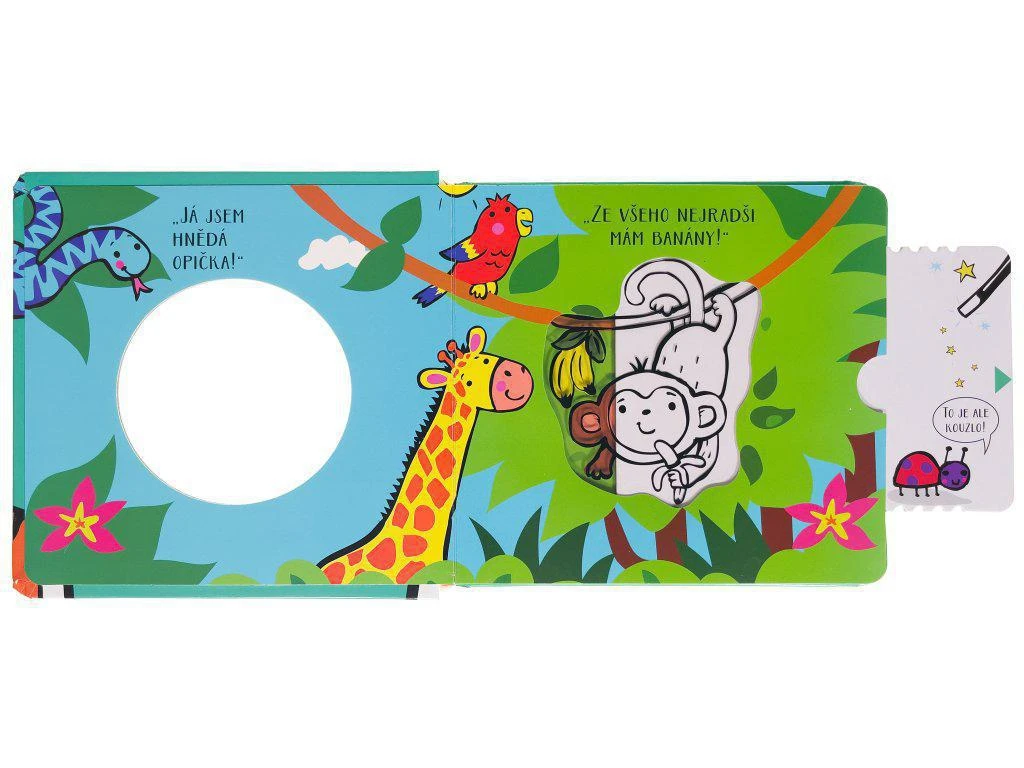 Zatiahni za obrázky v tejto mechanickej zvukovej knihe bez batérií a pričaruj zvieratkám z džungle farby.