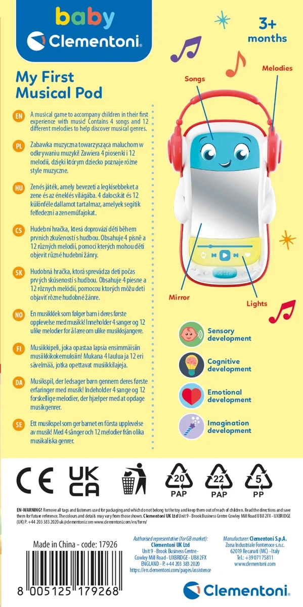 Tento prehrávač umožňuje deťom „hrať sa ako dospelí“ – pripomína skutočný hudobný prehrávač mamičky alebo otecka, takže prirodzene zapája zvedavosť aj fantáziu. Je súčasťou rady Baby Clementoni, ktorá je navrhnutá pre najmenších s ohľadom na bezpečnosť a vývojové potreby.