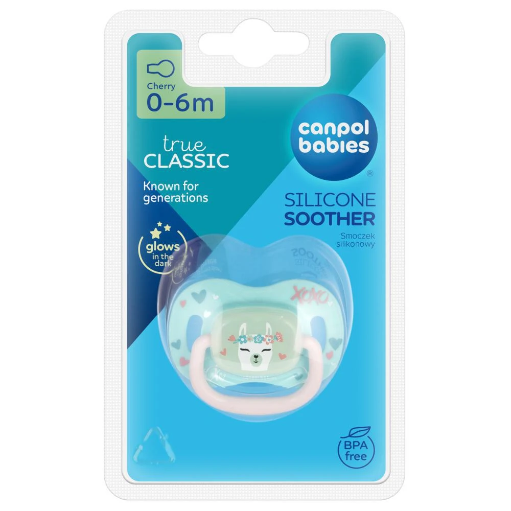 Cumlík so silikónovou špičkou v tvare čerešničky (guľatý tvar) vaše bábätko uvoľní a upokojí. Cumlík je vyrobený zo 100% hypoalergénneho silikónu, ktorý je bez chuti a zápachu, čo bábätku uľahčuje prijatie cumlíka. Silikónová špička je pevná a odolná proti deformácii. Vetracie otvory v štítku umožňujú priechod vzduchu a zabraňujú podráždeniu jemnej pokožky dieťaťa. Cumlík je bezpečný a ľahko sa udržuje v čistote - vhodný pre opakovanú dezinfekciu. Okrem toho má cumlík prvky svietiace v tme, čo uľahčuje jeho nájdenie v noci. Pri jeho výrobe neboli použité BPA ani iné škodlivé látky. Pohodlný úchyt cumlíka umožňuje pripevnenie na retiazku a uľahčuje jeho podávanie vášmu dieťaťu. Cumlík sa odporúča pre deti vo veku 0-6 mesiacov.