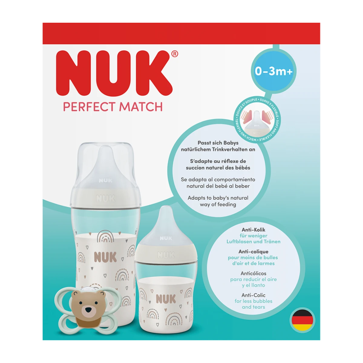 - 2× dojčenská fľaša NUK Perfect Match s patentovaným indikátorom kontroly teploty, jedna fľaša s objemom 150 ml vo veľkosti S (od 0 mesiacov pre materské mlieko), jedna fľaša s objemom 260 ml vo veľkosti M (od 3 mesiacov pre umelé dojčenské mlieko)