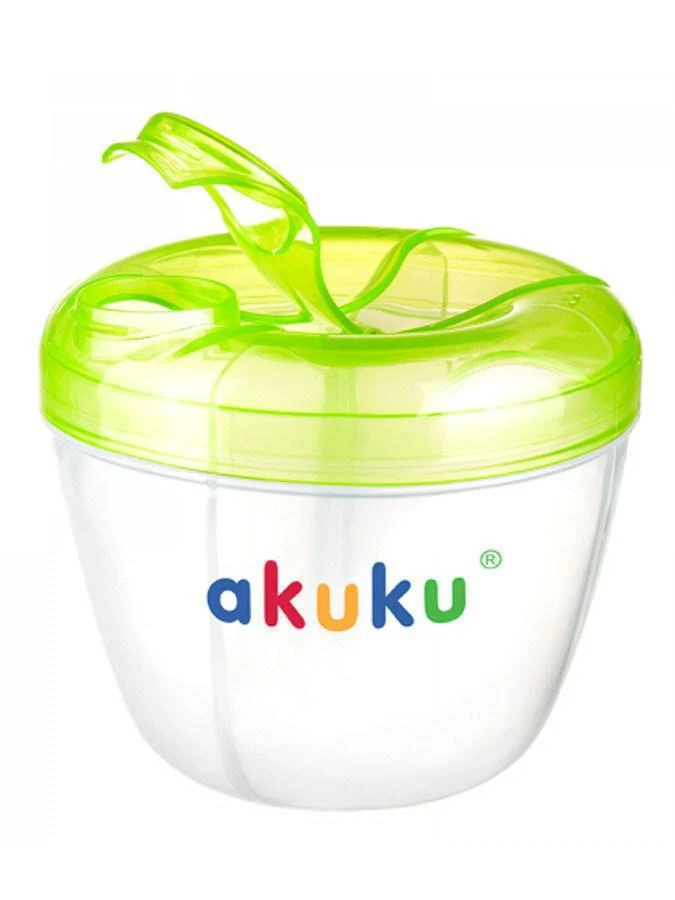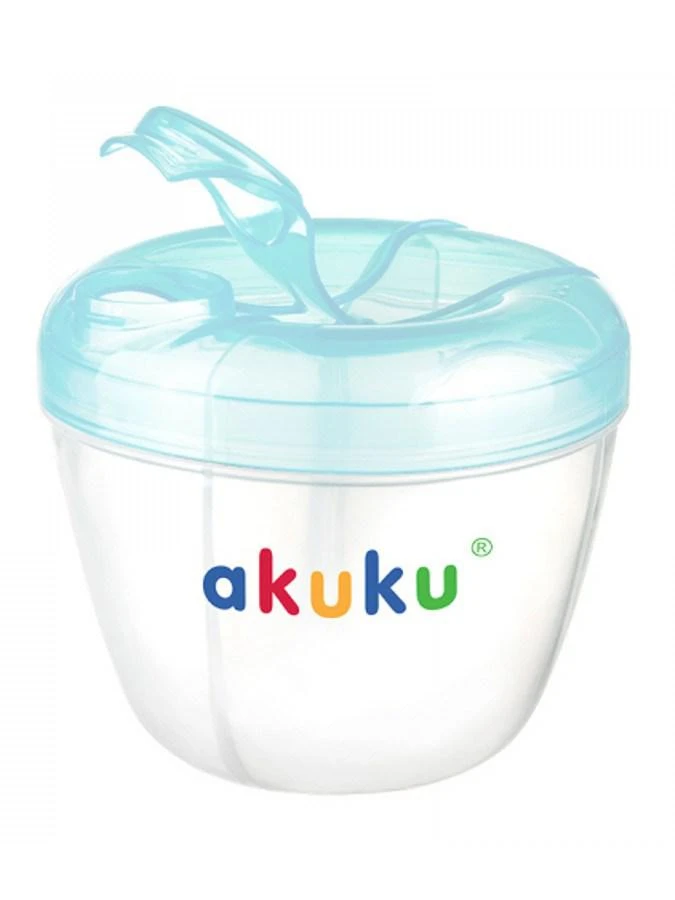 Dávkovač sušeného mlieka Akuku. Špeciálna nádobka so 4 samostatnými priehradkami, vďaka ktorým je možné odmerať a pripraviť 4 dávky dojčenského sušeného mlieka. Nádobka je veľmi praktická predovšetkým pri prechádzkach a cestovaní.