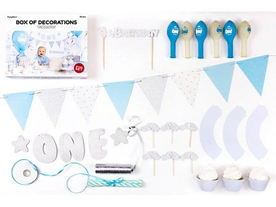 Set obsahuje: baner ONE 1ks, papierová girlanda 1ks, zápichy na cupcakeky 6ks, modré obaly na muffiny 6ks, zápich do torty 1ks, slamky 10ks, latexové balóniky v mixe dizajnov 6ks, strieborná stužka, svetlo modrá saténová stuha.