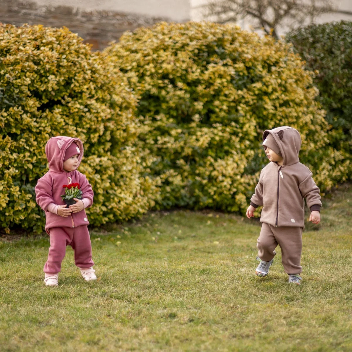 Naša bunda je vyrobená z počesanej teplákoviny známej ako "alpenfleece", ktorá je z rubovej strany jemne plyšová. Vďaka tomu je hrejivá, pružná a tak príjemná na dotyk.