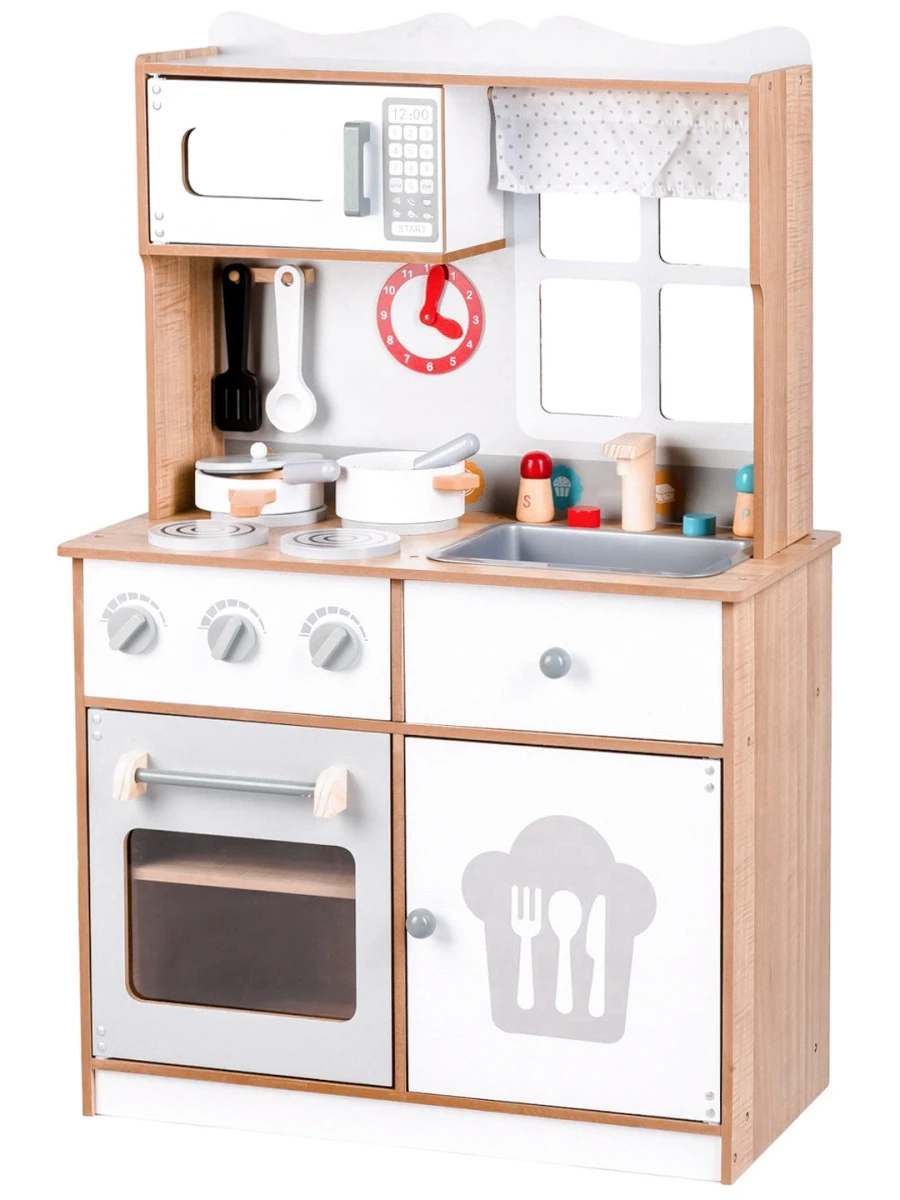 Ako v skutočnej kuchyni Kuchynka je vybavená troma otočnými gombíkmi pre sporák a rúru, ktoré pri otáčaní vydávajú realistické zvuky „kliknutia“. Veľké otváracie dvierka ukrývajú priestrannú skrinku, do ktorej sa zmestia všetky dôležité kuchynské doplnky. Vo výsuvnej zásuvke môžu deti uložiť drevené príbory alebo tanieriky, ktoré využijú pri servírovaní. Otváracie dvierka majú magnetické zatváranie, ktoré zabraňuje samovoľnému otváraniu. Malí kuchári môžu súčasne piecť, variť aj ohrievať jedlo v mikrovlnke. Po skončení „varenia“ je možné všetko umyť v priestrannom dreze a doplnky vrátiť na svoje miesta.