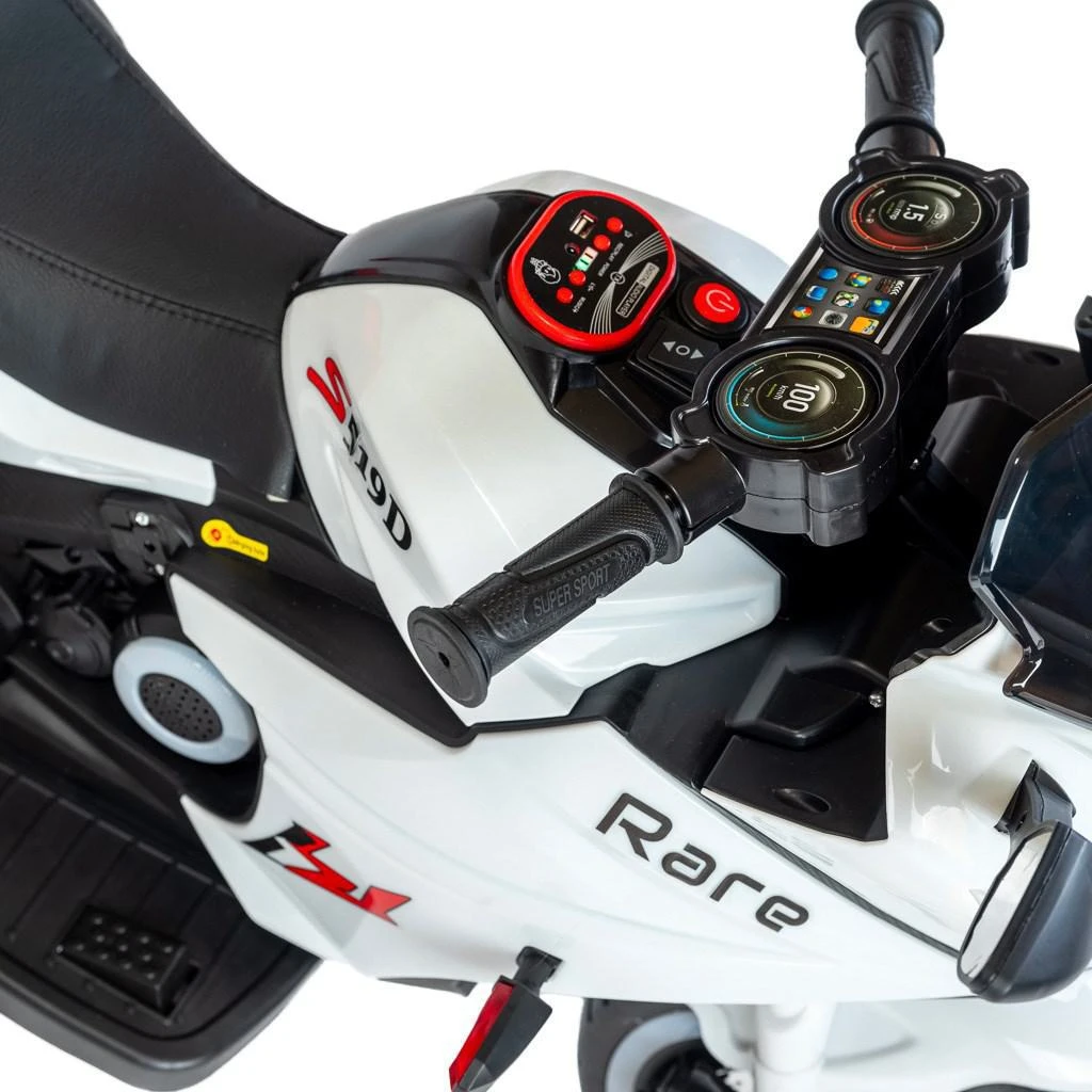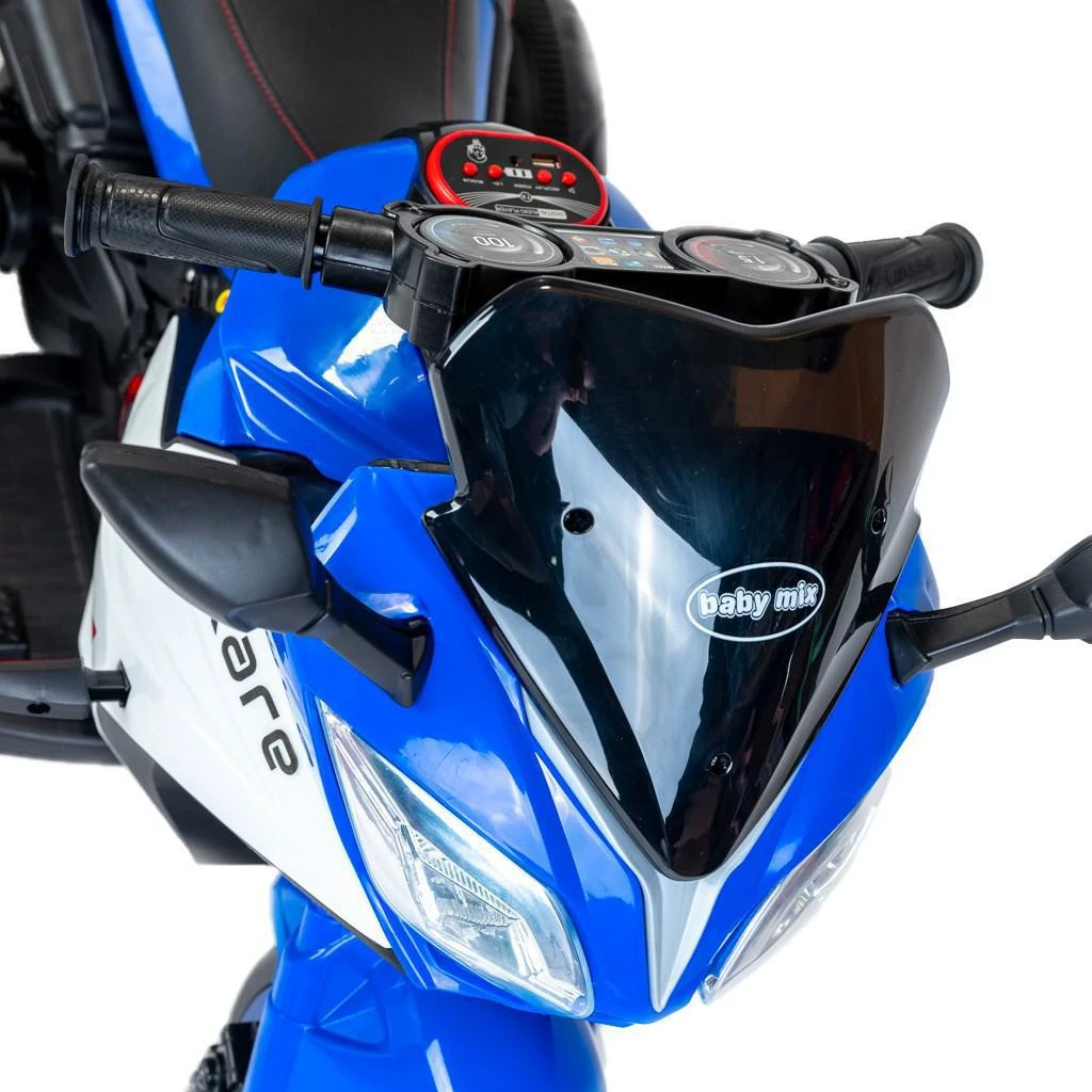 Detská elektrická motorka Rare Baby Mix je vybavená batériou 6V7AH a dvoma motormi s výkonom 380. Disponuje funkciou jednoduchého štartu na jedno tlačidlo, ktorá umožňuje jazdu vpred aj vzad. Motorka je vybavená hudbou, pesničkami pre deti, kartou na čítanie dát pre rané vzdelávanie, tromi kolesami a LED svetlometmi. Komfort zaisťuje kožené sedadlo.