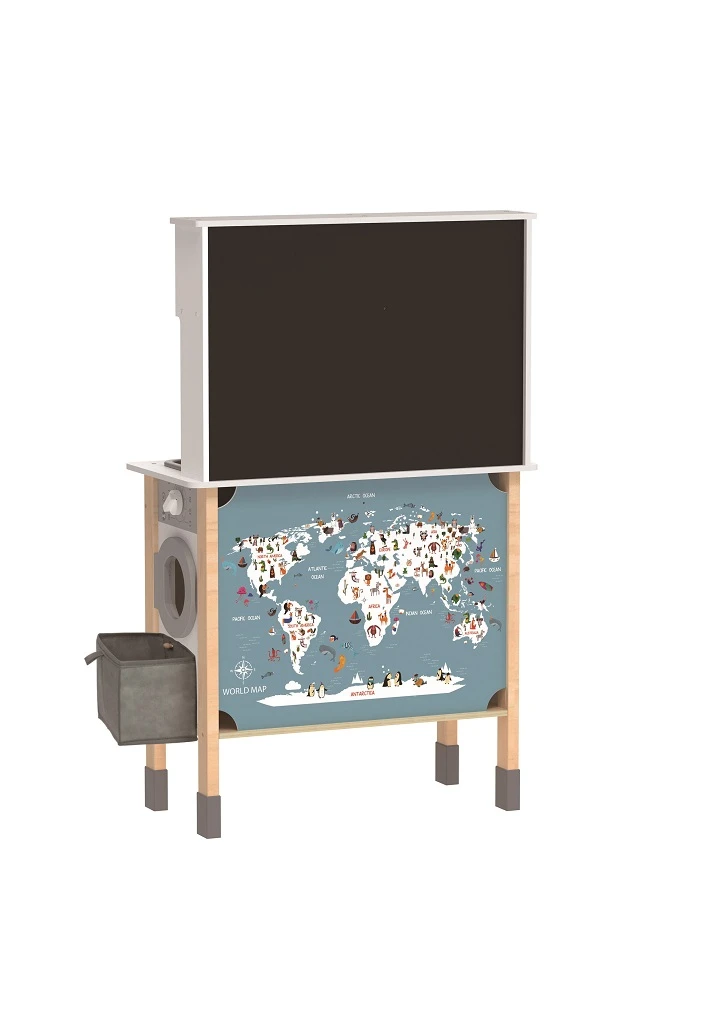 Chcete čerstvý koláčik priamo z pece? Alebo snáď máte zálusk na niečo vyprážané? S touto kuchynkou môžete mať menu, aké sa Vám zapáči. Je totiž plne vybavená! Nájdete tu všetko, čo v žiadnej modernej kuchyni nesmie chýbať - sporák s rúrou, umývačku riadu, mikrovlnku, drez, kávovar a samozrejme riad s náradím, ako sú taniere, hrniec, panvicu, hrnček a ďalšie. Na bočnej strane kuchynky je umiestnená práčka, z ktorej je možné vypranú bielizeň uložiť do zaveseného odnímateľného košíka. Ani zadná strana kuchynky nezostala nevyužitá. Na praktickú čiernu tabuľu môžu deti napísať odkaz, spísať suroviny receptov alebo niečo nakresliť. Ako inšpirácia im napríklad poslúži zábavná mapa so zvieratkami, ktorá je tiež zozadu. Tak si nasaďte kuchársku čiapku, oblečte praktickú zásteru a môžete začať variť. Keďže nám záleží na planéte Zem, nesmieme tiež zabudnúť na koše na triedenie! Hlavné vlastnosti: súčasťou je bohaté príslušenstvo multifunkčné, rozmanité využitie rozvíja komunikačné a sociálne zručnosti vyrobené z dreva s certifikáciou FSC® Značka a certifikát FSC® (Forest Stewardship Council) zaručuje, že drevo, z ktorého bol produkt vyrobený, nebolo vyťažené nelegálne a pochádza z lesov obhospodarovaných šetrným či prírode blízkym. Značka FSC® na výrobku znamená, že svojim nákupom pomáhate chrániť lesy a podporujete šetrné, zodpovedné či prírode blízke hospodárenie, vďaka ktorému sú naše lesy stabilnejšie, zdravšie, majú prirodzenú druhovú skladbu a lepšie odolávajú negatívnym následkom klimatických zmien.