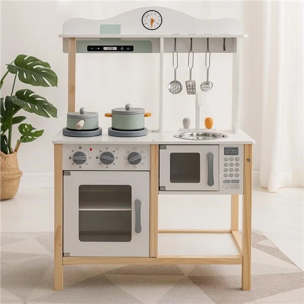 Realistické prvky ako otočné gombíky, drez s kohútikom, rúra a mikrovlnná rúra prinášajú autentický zážitok z varenia. Závesné kuchynské náčinie podporuje prirodzenú zvedavosť a učí deti poriadkumilovnosti.