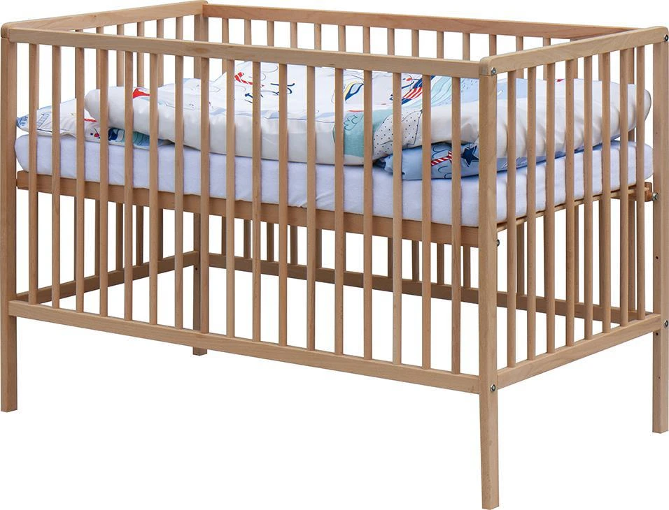 1. Detská drevená postieľka 120 x 60 cm - prírodný, masív borovice, 3 vyberacie priečky, 3 polohy roštu,