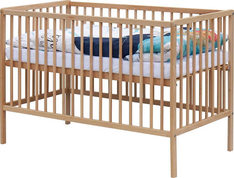 1. Detská drevená postieľka 120 x 60 cm - prírodný, masív borovice, 3 vyberacie priečky, 3 polohy roštu,
