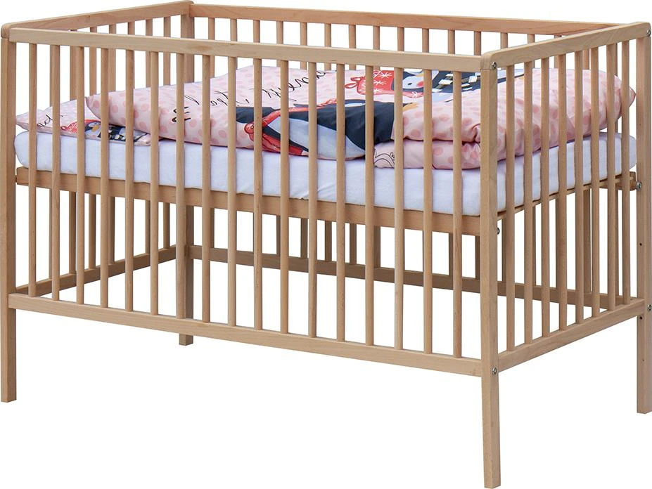 1. Detská drevená postieľka 120 x 60 cm - prírodný, masív borovice, 3 vyberacie priečky, 3 polohy roštu,