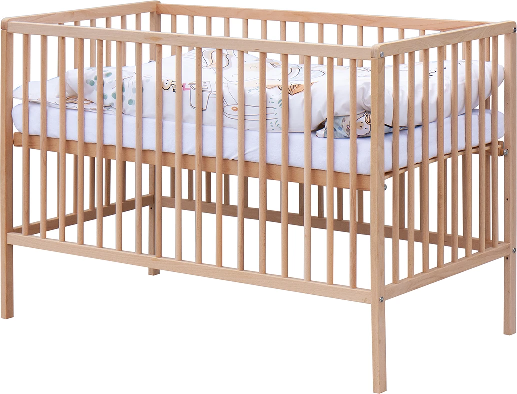 1. Detská drevená postieľka 120 x 60 cm - prírodný, masív borovice, 3 vyberacie priečky, 3 polohy roštu,