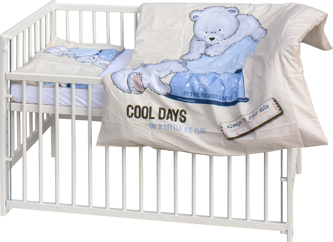 Základom kompletu je drevená postieľka o rozmere 120 × 60 cm, vyrobená z masívnej borovice v bielej farbe. Postieľka je vybavená sťahovacím bokom, ktorý uľahčuje manipuláciu s bábätkom, a roštom nastaviteľným do 6 polôh, vďaka čomu sa ľahko prispôsobí veku a vývoju dieťaťa.