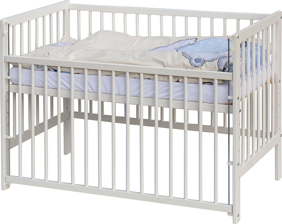 1. Detská drevená postieľka 120 x 60 cm - biela, masív borovice, sťahovací bok, 6 polôh roštu